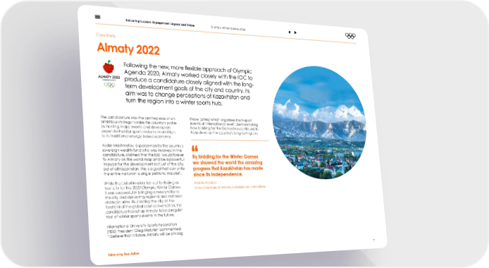Delivering Success: Engagement, Legacy and Vision Olympic Winter Games 2026 Case Study Almaty 2022 Following the new, more 昀氀exible approach of Olympic Agenda 2020, Almaty worked closely with the IOC to produce a candidature closely aligned with the long- term development goals of the city and country. Its aim was to change perceptions of Kazakhstan and turn the region into a winter sports hub. The candidature was the centrepiece of an those [cities] which organises multi-sport ambitious strategy to raise the country’s pro昀椀le events at international level”, demonstrating by hosting major events and develop an how bidding for the Games has continued to expanded winter sports industry in addition help develop the country’s long-term goals. to its traditional energy-based economy. Aydar Makhmetov, a spokesman for the country’s sovereign wealth fund who was involved in the candidature, claimed that the bid “would forever By bidding for the Winter Games 昀椀x Almaty on the world map and be a powerful we showed the world the amazing impulse for the development not just of the city, but of all Kazakhstan. This is a goal that can unite progress that Kazakhstan has made the entire nation in a single patriotic impulse”. since its independence. While the bid ultimately lost out to Beijing as Andrey Kryukov host city for the 2022 Olympic Winter Games, Vice-Chairman of Almaty Candidature Committee it was successful in bringing a new pro昀椀le to the city and delivering regional and national strategic aims. By placing the city at the forefront of the global sport conversation, the candidature has set up Almaty to be a regular host of winter sports events in the future. International University Sports Federation (FISU) President Oleg Matytsin commented: “I believe that in future, Almaty will be among Enhancing Reputation 7