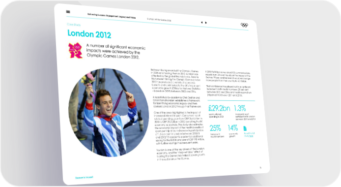 Delivering Success: Engagement, Legacy and Vision Olympic Winter Games 2026 Case Study London 2012 A number of signi昀椀cant economic impacts were achieved by the Olympic Games London 2012. Between being awarded the Olympic Games A 2013 VisitBritain survey asked 100 communications in 2005 and hosting them in 2012, London was experts from 24 countries about the impact of the affected by the global 昀椀nancial crisis. Despite Games: 99 per cent believed it would encourage this turbulent timing, the Olympic Games London more people from their country to visit Britain. 2012 has produced a variety of economic bene昀椀ts and contributed to the UK’s 14 per cent That con昀椀dence has played out in a signi昀椀cant economic growth (Of昀椀ce for National Statistics increase in both tourist numbers (25 per cent – based on GDP) between 2005 and 2016. between 2012 and 2016) and tourist expenditure (18 per cent between 2011 and 2015). A recent study by academics Chris Gratton and Girish Ramchandani establishes a framework for identifying economic legacy and then assesses London 2012 through that framework. £29.2bn 1.3% One of the areas highlighted is the impact of sports-related increase in sport increased interest in sport. Consumers’ sport- spending in 2012 participation in London related spending grew from GBP 26.4 billion in between 2010 and 2013 2010 to GBP 29.2 billion in 2012, bene昀椀ting the UK economy as a whole. The study also estimates the economic impact of the health bene昀椀ts of 25% 14% sports participation: an increase in participation of 1.3 per cent in London between 2010/11 increase in economic Read the full and 2012/13 represents a potential additional tourist numbers growth study here saving for the NHS in one year of GBP 195 million, with further savings in subsequent years. Tourism is one of the key drivers of the London economy, and the “shop-window” effect of hosting the Games has helped power growth in this sector since the Games. Economic Impact 13