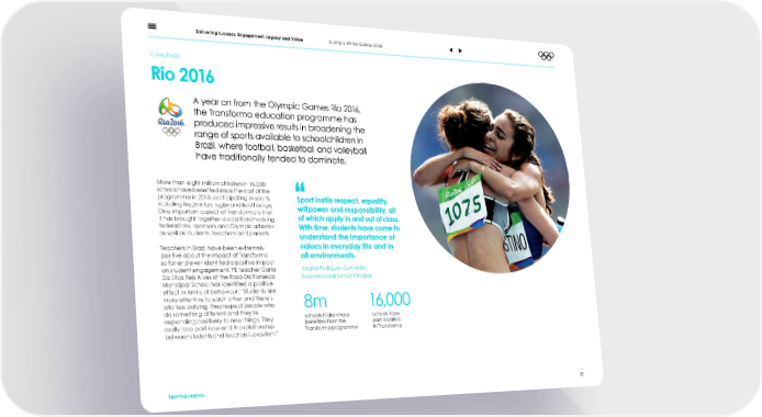 Delivering Success: Engagement, Legacy and Vision Olympic Winter Games 2026 Case Study Rio 2016 A year on from the Olympic Games Rio 2016, the Transforma education programme has produced impressive results in broadening the range of sports available to schoolchildren in Brazil, where football, basketball and volleyball have traditionally tended to dominate. More than eight million children in 16,000 schools have bene昀椀ted since the start of the programme in 2013, participating in sports Sport instils respect, equality, including badminton, rugby and 昀椀eld hockey. willpower and responsibility, all One important aspect of Transforma is that of which apply in and out of class. it has brought together a coalition involving federations, sponsors and Olympic athletes With time, students have come to as well as students, teachers and parents. understand the importance of values in everyday life and in Teachers in Brazil have been extremely positive about the impact of Transforma all environments. so far and even identi昀椀ed a positive impact Jorgina Rodrigues Guimarães on student engagement. PE teacher Carla Da Silva Reis Alves of the Rosa Da Fonseca Rosa Municipal School Principal Municipal School has identi昀椀ed a positive effect in terms of behaviour: “Students are more attentive to each other and there’s a lot less bullying. They respect people who 8m 16,000 do something different and they’re schoolchildren have schools have responding positively to new things. They bene昀椀ted from the participated really take part now and the relationship Transforma programme in Transforma between students and teachers is excellent.” Sporting Legacy 32