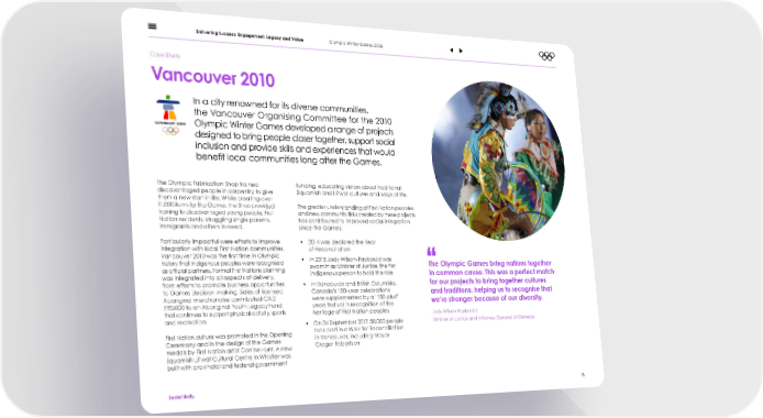 Delivering Success: Engagement, Legacy and Vision Olympic Winter Games 2026 Case Study Vancouver 2010 In a city renowned for its diverse communities, the Vancouver Organising Committee for the 2010 Olympic Winter Games developed a range of projects designed to bring people closer together, support social inclusion and provide skills and experiences that would bene昀椀t local communities long after the Games. The Olympic Fabrication Shop trained funding, educating visitors about traditional disadvantaged people in carpentry to give Squamish and Lil’wat cultures and ways of life. them a new start in life. While creating over 11,000 items for the Games, the Shop provided The greater understanding of First Nation peoples training to disadvantaged young people, First and new community links created by these projects Nation residents, struggling single parents, has contributed to improved social integration immigrants and others in need. since the Games: Particularly impactful were efforts to improve • 2014 was declared the Year integration with local First Nation communities. of Reconciliation Vancouver 2010 was the 昀椀rst time in Olympic • In 2015 Jody Wilson-Raybould was history that indigenous peoples were recognised The Olympic Games bring nations together as of昀椀cial partners. Formal First Nations planning sworn in as Minister of Justice, the 昀椀rst was integrated into all aspects of delivery, indigenous person to hold the role in common cause. This was a perfect match from efforts to promote business opportunities • In Vancouver and British Columbia, for our projects to bring together cultures to Games decision-making. Sales of licensed Canada’s 150-year celebrations and traditions, helping us to recognise that Aboriginal merchandise contributed CAD were supplemented by a “150-plus” we’re stronger because of our diversity. 190,000 to an Aboriginal Youth Legacy Fund years festival in recognition of the that continues to support physical activity, sports heritage of First Nation peoples and recreation. Jody Wilson-Raybould • On 24 September 2017, 50,000 people Minister of Justice and Attorney General of Canada First Nation culture was promoted in the Opening took part in a Walk for Reconciliation Ceremony and in the design of the Games in Vancouver, including Mayor medals by First Nation artist Corrine Hunt. A new Gregor Robertson Squamish Lil’wat Cultural Centre in Whistler was built with provincial and federal government Social Unity 18