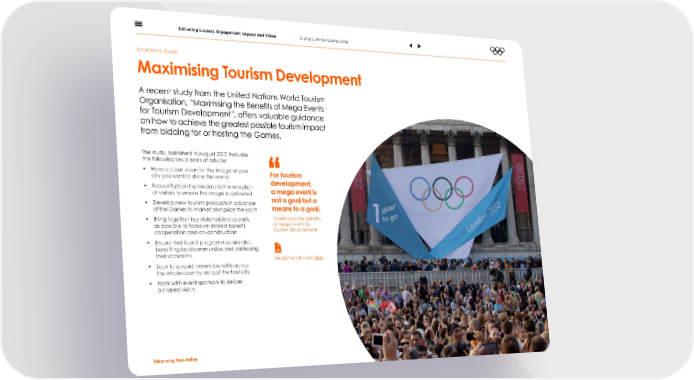 Delivering Success: Engagement, Legacy and Vision Olympic Winter Games 2026 Academic Study Maximising Tourism Development A recent study from the United Nations World Tourism Organisation, “Maximising the Bene昀椀ts of Mega Events for Tourism Development”, offers valuable guidance on how to achieve the greatest possible tourism impact from bidding for or hosting the Games. The study, published in August 2017, includes the following key pieces of advice: • Have a clear vision for the image of your For tourism city you want to show the world development, • Focus efforts on the media and the reception a mega event is of visitors to ensure this image is delivered not a goal but a • Develop new tourism products in advance means to a goal. of the Games to market alongside the sport • Bring together key stakeholders as early ‘Maximising the Bene昀椀ts of Mega Events for as possible to focus on shared bene昀椀t, Tourism Development’ cooperation and co-construction • Ensure that tourist programmes are also bene昀椀ting local communities and addressing their concerns Read the full study here • Look to spread tourism bene昀椀ts across the whole country, not just the host city • Work with event sponsors to deliver a shared vision Enhancing Reputation 8