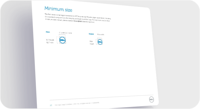 ‡inimum sie “he Dell standalone logo is restrited to 0.ˆ˝ or print and „0p‹ or digital appliations. ¢iolating this standard ompromises the integrit and legiilit o the logo. £or logo si¤es smaller than minimum si¤es shownœ please ontat [email protected] or approval. Print .ˆ” width –12.’ mm˜ Digital „0p‹ width 0.ˆ” height „0p‹ –12.’ mm˜ height €.† Dell Logo Usage Guidelines | 2012 Dell. All rights reserved. | Confidential