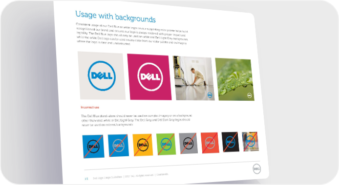 Usage ith bacgrounds Consistent usage o our Dell Blue or white logos on our supporting olor palette helps uild reognition o our rand and ensures our logo is alwas rendered with proper impat and legiilit. “he Dell Blue logo should onl e used on white and Dell Light Gra a™groundsœ while the white Dell logo an e used on an olor rom our olor palette and on imager where the logo is lear and unostruted. ncorrect use “he Dell Blue standalone should never e used on omple‹ imager or on a a™ground other than solid white or Dell Light Gra. “he Dell Gra and Dell Dar™ Gra logos should never e used on olored a™grounds. €.‹ Dell Logo Usage Guidelines | 2012 Dell. All rights reserved. | Confidential