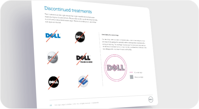 Discontinued treatments “he illustration on the right shows the slight modifiations that were made during our rand re resh. ‘lease re er to this guide to help identi our old versus new standalone logo. ‘lease disontinue all use o the old logos on the le t. dentiying the correct logo ¥ur new logoœ seen outlined in magenta elowœ retains the strengths o our previous mar™s suh as the anted E and the old tpe ae enirled with a strongœ simple ring. “he new logo inorporates resh harateristis suh as refinement o the letter orms to ma‹imi¤e larit and aestheti alane. ›t has een designed or ma‹imum impat and visiilit. Current logo ‘revious logo €.— Dell Logo Usage Guidelines | 2012 Dell. All rights reserved. | Confidential