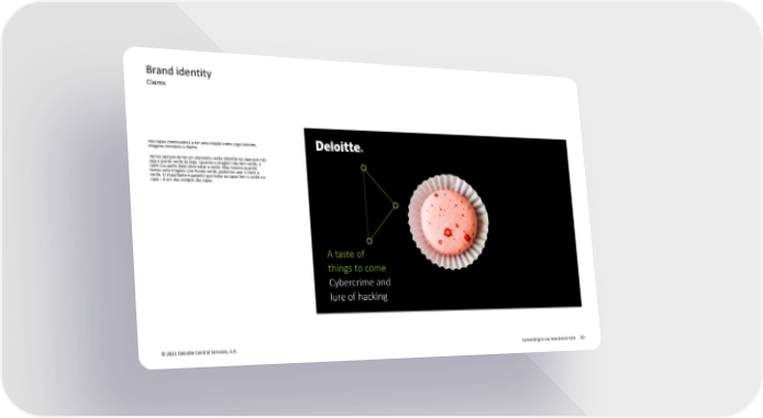 Brand identity Claims Nas capas continuamos a ter uma relação entre Logo Deloitte, imagens circulares e claims. Temos sempre de ter um elemento verde Deloittena capa que não seja o ponto verde do logo. Quando a imagem não tem verde, o calim (ou parte dele) deve estar a verde. Mas mesmo quando temos uma imagem com fundo verde, podemos usar o claim a verde. O importante é garantir que todas as capas tem o verde na capa – é um dos códigos das capas. A taste of things to come Cybercrime and lure of hacking © 2021 Deloitte Central Services, S.A. Connecting to our new brand rules 50