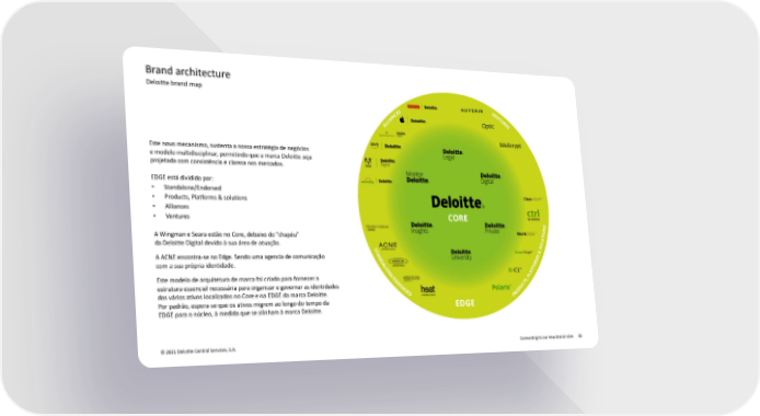 Brand architecture Deloitte brand map Este novo mecanismo, sustenta a nossa estratégia de negócios e modelo multidisciplinar, permitindo que a marca Deloitte seja projetada com consistência e clareza nos mercados. EDGE está dividido por: • Standalone/Endorsed • Products, Platforms & solutions • Alliances • Ventures A Wingmane Seara estão no Core, debaixo do “chapéu” da Deloitte Digital devido à sua área de atuação. A ACNE encontra-se no Edge. Sendo uma agencia de comunicação com a sua própria identidade. Este modelo de arquitetura de marca foi criado para fornecer a estrutura essencial necessária para organizar e governar as identidades dos vários ativos localizados no Core e na EDGE da marca Deloitte. Por padrão, espera-se que os ativos migrem ao longo do tempo da EDGE para o núcleo, à medida que se alinham à marca Deloitte. © 2021 Deloitte Central Services, S.A. Connecting to our new brand rules 36