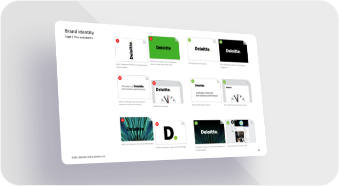 Deloitte Brand Book Page 47 Page 49Brand identity Logo | Dos and dont’s Brand training 48 © 2021 Deloitte Central Services, S.A. Connecting to our new brand rules Brand training
