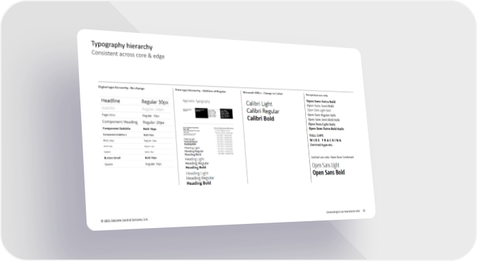 Deloitte Brand Book Page 54 Page 56Typography hierarchy Consistent across core & edge © 2021 Deloitte Central Services, S.A. Connecting to our new brand rules 55