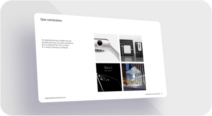 Quiz conclusions As espectativas face a Apple não são geradas pelo logo mas pela experiência que as pessoas têm com a marca. E o mesmo acontece na Deloitte. © 2021 Deloitte Central Services, S.A. Connecting to our new brand rules 21