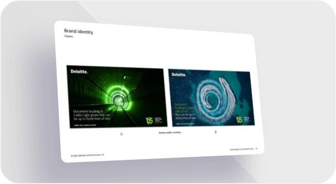 Deloitte Brand Book Page 50 Page 52Brand identity Claims A Ambas estão corretas. B © 2021 Deloitte Central Services, S.A. Connecting to our new brand rules 51
