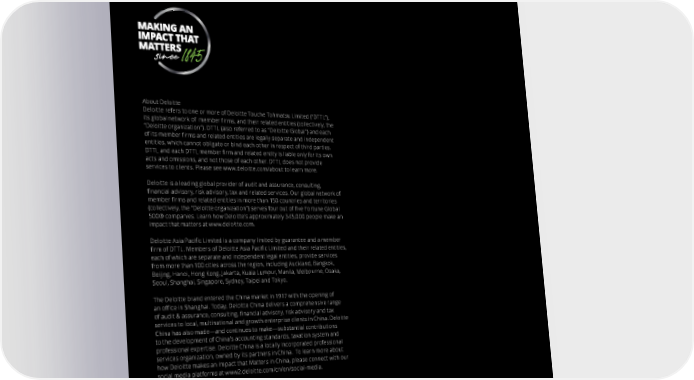 About Deloitte Deloitte refers to one or more of Deloitte Touche Tohmatsu Limited (“DTTL”), its global network of member firms, and their related entities (collectively, the “Deloitte organization”). DTTL (also referred to as “Deloitte Global”) and each of its member firms and related entities are legally separate and independent entities, which cannot obligate or bind each other in respect of third parties. DTTL and each DTTL member firm and related entity is liable only for its own acts and omissions, and not those of each other. DTTL does not provide services to clients. Please see www.deloitte.com/about to learn more. Deloitte is a leading global provider of audit and assurance, consulting, financial advisory, risk advisory, tax and related services. Our global network of member firms and related entities in more than 150 countries and territories (collectively, the “Deloitte organization”) serves four out of five Fortune Global 500® companies. Learn how Deloitte’s approximately 345,000 people make an impact that matters at www.deloitte.com. Deloitte Asia Pacific Limited is a company limited by guarantee and a member firm of DTTL. Members of Deloitte Asia Pacific Limited and their related entities, each of which are separate and independent legal entities, provide services from more than 100 cities across the region, including Auckland, Bangkok, Beijing, Hanoi, Hong Kong, Jakarta, Kuala Lumpur, Manila, Melbourne, Osaka, Seoul, Shanghai, Singapore, Sydney, Taipei and Tokyo. The Deloitte brand entered the China market in 1917 with the opening of an office in Shanghai. Today, Deloitte China delivers a comprehensive range of audit & assurance, consulting, financial advisory, risk advisory and tax services to local, multinational and growth enterprise clients in China. Deloitte China has also made—and continues to make—substantial contributions to the development of China's accounting standards, taxation system and professional expertise. Deloitte China is a locally incorporated professional services organization, owned by its partners in China. To learn more about how Deloitte makes an Impact that Matters in China, please connect with our social media platforms at www2.deloitte.com/cn/en/social-media. This communication contains general information only, and none of Deloitte Touche Tohmatsu Limited (“DTTL”), its global network of member firms or their related entities (collectively, the “Deloitte organization”) is, by means of this communication, rendering professional advice or services. Before making any decision or taking any action that may affect your finances or your business, you should consult a qualified professional adviser. No representations, warranties or undertakings (express or implied) are given as to the accuracy or completeness of the information in this communication, and none of DTTL, its member firms, related entities, employees or agents shall be liable or responsible for any loss or damage whatsoever arising directly or indirectly in connection with any person relying on this communication. DTTL and each of its member firms, and their related entities, are legally separate and independent entities. © 2022. For information, please contact Deloitte China. Designed by CoRe Creative Services. RITM1023439