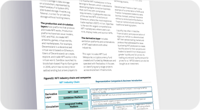 38 The Metaverse Overview : Vision, Technology, and Tactics | Industry and consensus during NFT minting and include ERC20, ERC721, and ERC1155. Developer tools help develop blockchain applications. Network storage is data storage on a blockchain, represented by InterPlanetary File System IPFS distributed storage. A wallet, e.g. Tokenall, is a tool for private key storage without holding tokens. The production and circulation layers host platforms that produce and trade NFT works. Production platforms have two usual models, UGC and PGC, to create NFT artworks, games, virtual worlds, and marketplaces. For example, Decentraland is a decentralized virtual world based on Ethereum. Users of Decentraland can create, explore, and trade NFT works in this virtual world. Sandbox launched its blockchain-based Play-to-Earn game in 2018, which has no storyline or settled ending but allows players to experience the game and acquire digital assets that are tradable in the blockchain. The Huanhe NFT marketplace in China belongs to Tencent, which is devoted to developing digital collection business that confirms with compliance requirements. Cryptopunks was one of the earliest NFT collections on Ethereum, where the most expensive trade reached USD7.5 million. OpenSea is the world's largest comprehensive NFT marketplace, where users can mint, display, trade, and auction NFTs. The derivative layer includes exhibition platforms and combinations of NFT applications with other industries. This layer includes NFT fund Metapurse, a cryptocurrency fund created and funded by Metakovan and operated with Twobadour. It focuses on identifying early-stage projects across blockchain infrastructure, finance, artwork, collectibles, and virtual real estate, and creates virtual museums, art exhibitions, music, and technology events. Decentralized finance or DeFi is one example of a combination of NFTs and finance. It empowers traders to save, borrow, transact, and buy insurance without a centralized entity (bank or financial institution) and overhaul the traditional banking system. Liquidity has often limited the financialization and popularization of digital art. NFT20 is a decentralized NFT derivatives trading market and protocol that addresses this issue by allowing NFT producers to create liquidity pools for their projects and traders to benefit from those pools' greater liquidity and fair prices. Its trading volume and liquidity ensure fair prices for all. NFT20 tokens can also be bought as an investment. Figure32: NFT industry chain and companies Source: Public information data, Deloitte analysis Infrastructure Technology Layer Production Layer Circulation Layer Derivative Layer NFT + Defi Exhibition Platform Integrated Trading Platform Digital Art Platform NFT Artwork NFT Games Virtual World Network Storage Blockchain Platform NFT Industry Chain Representative Companies & Business Introduction The NFT ecology of the Ethereum public chain was developed earlier, and it is the absolute overlord of the current NFT infrastructure Ant Chain is the external brand of Ant Group's intelligent technology business, dedicated to linking trust with technology IPFS is a global, peer-to-peer distributed file storage system Any NFT work holder can deposit works to the fund pool in exchange for NFT20 tokens for liquidity Decentraland is an Ethereum-based decentralized virtual reality platform that allows users to create, explore, and trade in virtual worlds Cryptopunks, one of the earliest NFTs on Ethereum, currently has the most expensive transaction at USD7.5 million Magic Core is Tencent's NFT trading software, committed to the implementation of digital collectibles business under a compliant framework Currently the world's largest comprehensive NFT trading platform, users can mint, display, trade, and auction NFTs Metapurse hosts NFT art, music and tech events where anyone can participate remotely