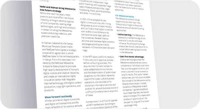 46 The Metaverse Overview : Vision, Technology, and Tactics | Metaverse tactics for enterprises development of the digital industry and pushing the integration of the Metaverse, big data, cloud computing, blockchain, geospatial information, and quantum technology with the real economy. Hefei and Hainan bring Metaverse into future strategy Within the next five years, Hefei plans to put more effort into future industry, aiming to develop a group of pilot companies, leading-edge technologies, and high end products in areas including the Metaverse, superconducting materials, and precision medicine. In Hainan, meanwhile, the Sanya Municipal People's Government and NetEase have signed a strategic cooperation agreement in which NetEase base its Hainan headquarters in Sanya. From this new base, it will develop the NetEase Metaverse Industrial Base project to promote high-quality development of Hainan's digital culture and creative industries, and create an international digital innovation center that integrates internet technology with digital content production, copyright operations, and products. Move forward cautiously China's policies on digital currencies and digital art transactions are the main reflection of its cautious attitude towards the Metaverse China has strict supervision on digital assets. Back in 2013 and 2017, the People's Bank of China and other government departments issued notices clarifying that Bitcoin does not have the same legal status as fiat currencies and financial institutions should not use it to price products or services, or directly or indirectly provide Bitcoin-related services. The notices clarify that token issuance is essentially an unapproved, illegal public financing, with suspected illegal sales of tokens and securities, illegal fundraising, fraud, pyramid schemes, and other illicit activities. In 2021, China adopted stricter digital currency policies, with mining designated as an eliminated industry and clarification that digital currencies such as Bitcoin and Ethereum do not have the same legal rights as fiat currencies. Related financial activities and overseas digital currency exchanges providing services to residents in China have been declared illegal. In the NFT space, platforms needs to finish a very strict approval process before conducting business. This requires them to have licenses for value-added telecommunications and the dissemination of audio-visual programs via information networks, a permit for cyber culture business operations, one recordation for blockchain information services and another for artwork business record. It is difficult for enterprises to acquire all of these. Furthermore, it is difficult to operate an NFT marketplace. According to the Implementation Opinions of the General Office of the State Council on Straightening out and Rectifying Various Types of Trading Venues, standardized contract transactions cannot be conducted by centralized trading methods including call or continuous auctions, electronic matching, anonymous trading. The Opinions also prohibit acting as a market maker and other trading methods. In addition, as NFTs are considered to have financial attributes, marketplace must obtain approvals from the State Council and its financial authorities. 4.4 Metaverse tactics The Metaverse presents a huge opportunity but also major risks. Enterprises aiming to embrace the Metaverse should take the following approaches: • Active learning. The Metaverse is essentially a new technology-driven revolution in society with deep influence. To embrace this change, enterprises should understand its full scope before seeking opportunities in the Metaverse. • Gain first-mover advantage. Enterprises hoping to enter the Metaverse and provide services to companies or individuals must move fast, provide targeted solutions, and enter customers' consciousness to amplify results. The capital market, enterprises, and individuals accepted the concept of the Metaverse rapidly. Despite recent drops in market valuations of Metaverse-related companies, it gained acceptance much faster than the internet did when it emerged. This means each window of opportunity will not be open for long and first-mover advantage is key. • Treat the Metaverse as an advanced digital transformation. Businesses that want to empower themselves with Metaverse technologies and models can consider these part of their overall digital transformation and intelligent