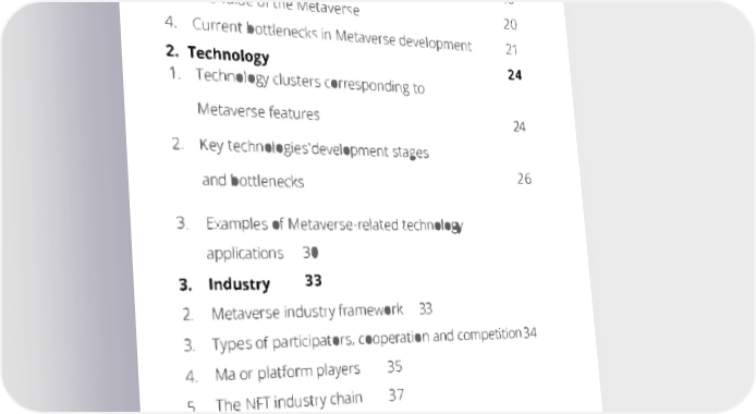 Preface 1. Vision and Values 1 . Vision and 4 meanings of the Metaverse 2. Six Characteristics of the Metaverse 3. The value of the Metaverse 4. Current bottlenecks in Metaverse development 2. Technology 1 . Technology clusters corresponding to Metaverse features 2. Key technologies'development stages and bottlenecks 3. Examples of Metaverse-related technology applications 30 3. lndustry 33 4 10 10 16 20 21 24 24 26 2. Metaverse industry framework 33 3. Types of participators, cooperation and competition34 35 4. Major platform players 5. The NFT industry chain 37 4. Metaverse tactics for enterprises 43 2. Metaverse development 43 3. Potential risks 44 4. China's attitude to the Metaverse44 5. Metaverse tactics 46