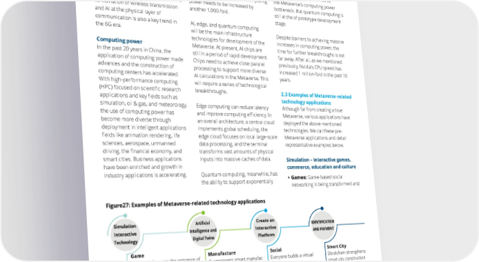 30 The Metaverse Overview : Vision, Technology, and Tactics | Technology networks is an important direction of development. Deterministic network technology with high reliability and low latency will accelerate the 6G era and shape a wide range of applications. The combination of wireless transmission and AI at the physical layer of communication is also a key trend in the 6G era. Computing power In the past 20 years in China, the application of computing power made advances and the construction of computing centers has accelerated. With high-performance computing (HPC) focused on scientific research applications and key fields such as simulation, oil & gas, and meteorology, the use of computing power has become more diverse through deployment in intelligent applications fields like animation rendering, life sciences, aerospace, unmanned driving, the financial economy, and smart cities. Business applications have been enriched and growth in industry applications is accelerating. Current computing, storage, and networking infrastructure cannot realize a true Metaverse vision. To achieve this true Metaverse, computing power needs to be increased by another 1,000-fold. AI, edge, and quantum computing will be the main infrastructure technologies for development of the Metaverse. At present, AI chips are still in a period of rapid development. Chips need to achieve close parallel processing to support more diverse AI calculations in the Metaverse. This will require a series of technological breakthroughs. Edge computing can reduce latency and improve computing efficiency. In an overall architecture, a central cloud implements global scheduling, the edge cloud focuses on local large-scale data processing, and the terminal transforms vast amounts of physical inputs into massive caches of data. Quantum computing, meanwhile, has the ability to support exponentially growing data operations, has the potential to break through into the "post-Moore" era, and can solve the Metaverse's computing power bottleneck. But quantum computing is still at the of prototype development stage. Despite barriers to achieving massive increases in computing power, the time for further breakthroughs is not far away. After all, as we mentioned previously, Nvidia's CPU speed has increased 1 million-fold in the past 10 years. 2.3 Examples of Metaverse-related technology applications Although far from creating a true Metaverse, various applications have deployed the above-mentioned technologies. We call these pre- Metaverse applications and detail representative examples below. Simulation – interactive games, commerce, education and culture • Games: Game-based social networking is being transformed and Figure27: Examples of Metaverse-related technology applications Source: Deloitte analysis Game VR games become the entrance of metaverse Business Shopping software introduces VR product try-on interface Manufacture AI empowers smart manufac- turing Medical AI improves medical efficiency Social Everyone builds a virtual community Film and television Support real-time audio and video interactive creation Smart City Blockchain strengthens smart city construction Pay Blockchain makes virtual currency transactions possible Education VR/AR innovative teaching methods Simulation Interactive Technology Artificial Intelligence and Digital Twins Create an Interactive Platform IDENTIFICATION AND PAYMENT Culture Forbidden City AR Cultural Tourism Exhibition integrates face, gesture recognition and somatosensoryinter- action