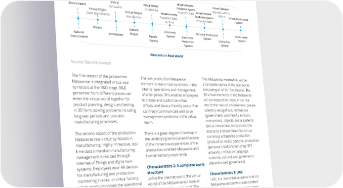 17 The Metaverse Overview : Vision, Technology, and Tactics | Vision and Values The first aspect of the production Metaverse is integrated virtual-real symbiosis at the R&D stage. R&D personnel from different places can enter the virtual world together for product planning, design, and testing in 3D form, solving problems including long test periods and unstable manufacturing processes. The second aspect of the production Metaverse real-virtual symbiosis in manufacturing. Highly immersive, real- time data simulation manufacturing management is realized through Internet-of-Things and digital twin systems. Employees wear AR devices for manufacturing and production monitoring in a real or virtual factory, which greatly improves the operational efficiency of field personnel and overall efficiency of remote managers. The third aspect of the production Metaverse is real-virtual symbiosis during sales, split into three scenarios: during sales, in use, and after- sales maintenance. This supports interactions between employees and customers in the virtual world looking at the same digital twins products. The last production Metaverse element is real-virtual symbiosis in the internal operations and management of enterprises. This enables employees to create and customize virtual offices, and have a friendly avatar that can freely communicate and solve management problems in the virtual realm. There is a great degree of overlap in the underlying technical architecture of the immersive experiences of the production-oriented Metaverse and human sensory experience. Characteristics 2: A complete world structure Unlike the internet world, the virtual world of the Metaverse will have all 10 elements of the real world. The existing internet world represented by media, social networking, e-commerce, and industrial internet is a world in narrow-sense, simulating only part of whole social, business, and production systems in the real world. The existing internet world does not clearly reflect elements such as real estate development, government and governance, and social civilization. The Metaverse, meanwhile, will be a complete replica of the real world, simulating all of its 10 elements. The 10 virtual elements of the Metaverse will correspond to those in the real world: the natural environment, people (identity recognition), institutions (government, community, schools, enterprises) , objects, social systems (social interaction, social rules), the economy (transaction rules, virtual currency), enterprise production (production rules), personal production (personal creations including NFT artwork), civilization (language, customs, culture), and governance (decentralized governance). Characteristics 3: UGC UGC is a new creative arena in which Metaverse residents create content and applications in their own virtual worlds. Unlike internet platforms, where owners create most of the content and establish the rules, users will create their own content and rules in the Metaverse, with platforms providing the technical tools they need. For example, in Roblox, people can use some simple tools embedded in the Figure14: The complete world structure of the virtual world Source: Deloitte analysis Elements in Real World Elements in Virtual World Virtual Governance System Governance System Virtual Civilization Language, Customs, Culture Civilization System Virtual Personal Production System Personal Creation Personal Production System Virtual Enterprise Production System Production Rules Enterprise Production System Virtual Economy Transaction Rules, Currency Economic System Virtual Society Social Media People Society Virtual People Identification Natural People Virtual institutions Institutions Virtual Environment Natural Environment Virtual Object Code Identification Object