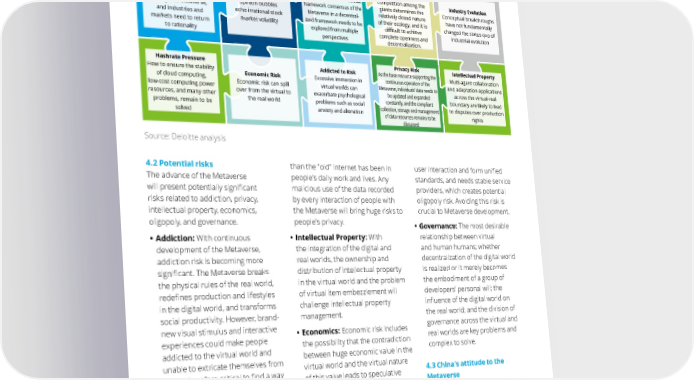 44 The Metaverse Overview : Vision, Technology, and Tactics | Metaverse tactics for enterprises 4.2 Potential risks The advance of the Metaverse will present potentially significant risks related to addiction, privacy, intellectual property, economics, oligopoly, and governance. • Addiction: With continuous development of the Metaverse, addiction risk is becoming more significant. The Metaverse breaks the physical rules of the real world, redefines production and lifestyles in the digital world, and transforms social productivity. However, brand- new visual stimulus and interactive experiences could make people addicted to the virtual world and unable to extricate themselves from it. It is therefore critical to find a way to balance the relationship between the real world and the Metaverse, letting the latter play a more positive role. • Privacy: The Metaverse will become a massive, extremely complex, open, and dynamically optimized system that is more deeply integrated than the "old" internet has been in people's daily work and lives. Any malicious use of the data recorded by every interaction of people with the Metaverse will bring huge risks to people's privacy. • Intellectual Property: With the integration of the digital and real worlds, the ownership and distribution of intellectual property in the virtual world and the problem of virtual item embezzlement will challenge intellectual property management. • Economics: Economic risk includes the possibility that the contradiction between huge economic value in the virtual world and the virtual nature of this value leads to speculative behavior, or that the Metaverse is attacked, invaded, disrupted, and destroyed, damaging real-world economic and social development. • Oligopoly: Construction of the Metaverse requires a huge amount of investment to realize mass user interaction and form unified standards, and needs stable service providers, which creates potential oligopoly risk. Avoiding this risk is crucial to Metaverse development. • Governance: The most desirable relationship between virtual and human humans; whether decentralization of the digital world is realized or it merely becomes the embodiment of a group of developers' personal will; the influence of the digital world on the real world; and the division of governance across the virtual and real worlds are key problems and complex to solve. 4.3 China's attitude to the Metaverse Generally, China's attitude towards the Metaverse has been to embrace it actively but move forward cautiously. China welcomes Metaverse technology innovation and industrial cultivation, but is strict with digital currency and NFT trading. Embrace actively Source: Deloitte analysis Figure40: Potential risks Capital Manipulation There are still many uncertainties in the embryonic Metaverse, and industries and markets need to return to rationality Opinion Bubble Irrational public opinion bubbles echo irrational stock market volatility Hashrate Pressure How to ensure the stability of cloud computing, low-cost computing power resources, and many other problems, remain to be solved Economic Risk Economic risk can spill over from the virtual to the real world Ethical Constraints How to construct the ethical framework consensus of the Metaverse in a decentral- ized framework needs to be explored from multiple perspectives Monopoly Tension Competition among the giants determines the relatively closed nature of their ecology, and it is difficult to achieve complete openness and decentralization. Privacy Risk As the base resource supporting the continuous operation of the Metaverse, individuals’ data needs to be updated and expanded constantly, and the compliant collection, storage and management of data resources remains to be discussed Addicted to Risk Excessive immersion in virtual worlds can exacerbate psychological problems such as social anxiety and alienation Industry Evolution Conceptual breakthroughs have not fundamentally changed the status quo of industrial evolution Intellectual Property Multi-agent collaboration and adaptation applications across the virtual-real boundary are likely to lead to disputes over production rights