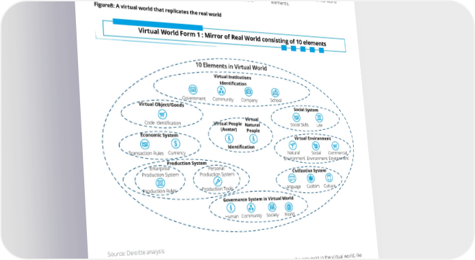 12 The Metaverse Overview : Vision, Technology, and Tactics | Vision and Values Derived from its depiction in Snow Crash, the future Metaverse will include a virtual world that simulates all real- world elements. There are 10 elements in the real world: environment, people, objects, institutions, society, and economic, enterprise production, individual production, civilization, and governance systems. There are also 10 elements in the virtual world corresponding to these 10 real world elements. Figure8: A virtual world that replicates the real world Source: Deloitte analysis 10 Elements in Virtual World Virtual People (Avatar) Virtual Natural People Virtual Institutions Identification Identification School Community Company Government Virtual Object/Goods Economic System Social System Production System Enterprise Production System Personal Production System Virtual Environment Civilization System Governance System in Virtual World Currency Transaction Rules Social Skills Natural Environment Social Environment Commercial Environment Community Human Society World Language Custom Culture Production Tools Production Rules Code Identification Law Virtual World Form 1 : Mirror of Real World consisting of 10 elements Meaning 2: A native virtual world The Metaverse includes another virtual world. This is an innovative, native virtual world that has all the elements of the real world, but whose elements have no corresponding elements in the real world. People can use their imaginations and creativity to create completely virtual people, objects, and environments. New entities, new regulations, and new wisdom will embody innovation in this virtual native world. This new entity is home to people, objects, and environments shaped entirely in the virtual world, with no real world counterparts. In this Metaverse, there will be new "people" who are not avatars, but people created and who only exist in the virtual world, like virtual digital employee Cui Xiaopan, who won the 2021 Best Newcomer Award at Vanke Headquarters. Other examples include non-fungible token (NFT) objects such as pictures, audio, videos, artwork, and buildings. In this native virtual world, liberating some of the physical and spatial stipulations of the real world create a virtual natural environment.