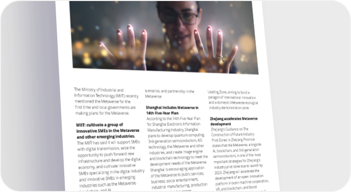 45 The Metaverse Overview : Vision, Technology, and Tactics | Metaverse tactics for enterprises The Ministry of Industrial and Information Technology (MIIT) recently mentioned the Metaverse for the first time and local governments are making plans for the Metaverse. MIIT: cultivate a group of innovative SMEs in the Metaverse and other emerging industries. The MIIT has said it will support SMEs with digital transmission, seize the opportunity to push forward new infrastructure and develop the digital economy, and cultivate innovative SMEs specializing in the digital industry and innovative SMEs in emerging industries such as the Metaverse, blockchain, and AI. Beijing Municipal Administrative Center (Beijing MC) the first mover At the Beijing MC Industry Development Promotion Conference in Tongzhou District, Beijing issued a series policies including "Metaverse- related policies" focusing on content design, industrial spaces, application scenarios, and partnership in the Metaverse. Shanghai includes Metaverse in 14th Five-Year Plan According to the 14th Five-Year Plan for Shanghai Electronic Information Manufacturing Industry, Shanghai plans to develop quantum computing, 3rd-generation semiconductors, 6G technology, the Metaverse and other industries, and create image engine and blockchain technology to meet the development needs of the Metaverse. Shanghai is encouraging application of the Metaverse to public services, business, social entertainment, industrial manufacturing, production security, and video games. Jiangsu to build Metaverse Ecological Industry Demonstration Zone Binhu District of Wuxi City launched the Metaverse Ecological Industry Development Plan of Taihu Bay Science and Technology Innovation Leading Zone, aiming to build a paragon of international innovation and a domestic Metaverse ecological industry demonstration zone. Zhejiang accelerates Metaverse development Zhejiang's Guidance on The Construction of Future Industry Pilot Zones in Zhejiang Province states that the Metaverse, alongside AI, blockchain, and 3rd-generation semiconductors, is one of the most important strategies for Zhejiang's industry pilot zone due to launch by 2023. Zhejiang will accelerate the development of an open innovation platform in brain-machine cooperation, VR, and blockchain, and boost industrial technology and integrated innovations. Wuhan writes Metaverse into government work report The government work report of the 15th People's Congress of Wuhan in Hubei Province talks about accelerating