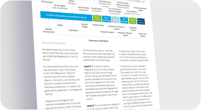 14 The Metaverse Overview : Vision, Technology, and Tactics | Vision and Values be when people rely on the virtual world more than they rely on the real world that the Metaverse will be fully formed. As mentioned earlier, the virtual and real world each have 10 elements. In this "4th Metaverse", these 10 elements (environment, people, objects, institutions, and society, and economic, enterprise production, individual production, civilization, and governance systems) will converge and interact. Integration (convergence and interaction) between the virtual and real worlds has four levels of varying difficulty, set out below from the easiest to most difficult: Level 1: The interaction of enterprise production systems. This sees the virtual world replicate and support the real world. For example, digital twin technology generates digital deconstructions and simulations of real machine equipment to support operational state prediction and Figure10: Convergence and Interaction of virtual-world and real-world elements Source: Deloitte analysis maintenance for physical machines. Many production and manufacturing scenarios have already explored and applied digital twin technology. Level 2: This level will see the integration of environment, people, objects, and institutions through unified coding rules and identification systems between the virtual and real world; the integration of the virtual and real economies through value exchange rules; and the integration of personal production systems through NFT-related copyright (virtual IP and real IP). Level 3: This level sees the integration of society and civilization, becoming even closer to the essence of the real world and thus much more difficult, encompassing social rules and systems of civilization that require long-term thinking, collision, and polishing. Level 4: The integration of governance rules is the most challenging Metaverse scenario, as it will involve disputes around and competition for governance rights. That is, who will govern this Metaverse, humans or AI in the virtual world, Metaverse companies or real-world government? Competition for control between government and the virtual world has already occurred in the clash for control of the data of billions of users between government and the internet giants. For the first time in human history, companies now own more of people's information than governments do, which has caused alarm in some government circles. The fight for governance of the Metaverse will intensify, with some pessimists positing that Metaverse governance rules will even affect and oppress the real world. In future, various virtual spaces, communities, and societies will emerge. Small, personal virtual spaces will combine to form a large virtual community spaces. Multiple virtual community spaces will combine and converge to form even larger and more diverse virtual social spaces. Different Virtual Economy Transaction Rules, Currency Virtual Civilization Language, Customs, Culture Virtual Society Social Media Low Difficulty of Merging High People Society Personal Production System Economic System Enterprise Production System Civilization System Governance System Elements in Real World Elements in Virtual World Virtual People Identification Natural People Virtual Institutions Institutions Virtual Environment Natural Environment Value Exchange Virtual Supports Reality NFT Copyright Civilization Rules Competition for Governance Virtual Object Code Identification Object Unified Coding Rules & Identification System Social Rules Virtual Enterprise Production System Production Rules Virtual Personal Production System Personal Creation Virtual Governance System