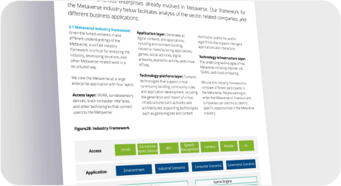 33 The Metaverse Overview : Vision, Technology, and Tactics | Industry Access Mobile PC BCI Somatose- nsory Devices Speech Recognition VA/AR Camera Tech Infrastructure IoT Internet Cloud Computing Wires and Wireless Communications Networks Tech Platform (Engine) Digital Twins Game Engine Blockchain AI Spatial Computing NFT Application Industrial Scenarios Industrial Scenarios Consumer Scenarios Governance Scenarios Environment 3. Industry 3.1 Metaverse industry framework Given the broad contents in and different understandings of the Metaverse, a unified industry framework is critical for analyzing the industry, developing solutions, and other Metaverse-related work in a structured way. We view the Metaverse as a large enterprise application with four layers: Access layer: VR/AR, somatosensory devices, brain-computer interfaces, and other technologies that connect users to the Metaverse. There are numerous enterprises already involved in Metaverse. Our framework for the Metaverse industry below facilitates analysis of the sector, related companies, and different business applications. Application layer: Generates all digital contents and applications, including environment building, industrial manufacturing applications, games, social activities, digital artworks, economic activity, and virtual offices. Technology platform layer: Contains technologies that support virtual community building, community rules and application development, including the generation and import of virtual infrastructures such as blocks and architectures; supporting technologies such as game engines and content distribution platforms; and AI algorithms that support intelligent applications and interaction. Technology infrastructure layer: The underlying technologies of the Metaverse including internet, IoT, 5G/6G, and cloud computing. We use this industry framework to compare different participants in the Metaverse. People wanting to enter the Metaverse or investors and companies can use this to identify specific opportunities in the Metaverse industry. Figure28: Industry Framework Source: Deloitte analysis