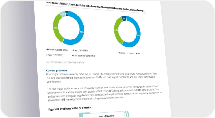 41 The Metaverse Overview : Vision, Technology, and Tactics | Industry Demographically, NFT market is more mature overseas, especially in Europe and the US. Among the biggest NFT buyers, 55% are in the Americas, 27% in Europe, and only 18% in Asia, mainly due to the greater flexibility of overseas markets. Current problems Four major problems currently beset the NFT market, the most prominent being security and market supervision. There is a long way to go before the massive adoption of NFTs and it will require cooperation and joint efforts from multiple counterparts. The four major problems are a lack of liquidity, with high price thresholds and no fair pricing mechanism; the security and uncertainty of blockchain storage, with occasional NFT losses; NFTs being a niche market limited to digital art, collections, and games, with a long way to go before mass adoption; and as-yet-unsettled market rules, with regulatory development far slower than NFT market growth, and the lack of a gateway for NFT supervision. Figure37: Profile of NFT bidders and buyers Figure38: Problems in the NFT market Source: leadleo.com, Deloitte analysis Source: Deloitte analysis 发展面临 的问题 流动性匮乏 储存安全不确定 应用领域小众 市场规则不完善 58% 33% 6% 3% Millennials (1981-1996) X age (1965-1980) Z age (1997-2012) baby boomers (1946-1964) 55% 33% 6% America Europe Asia NFT dealers/Bidders, Users Portfolio: Take Everyday: The first 5000 Days the Bidding of as an Example Problems Lack of Liquidity Uncertain Storage Security Niche Application Field Market Rules Are Not Perfect