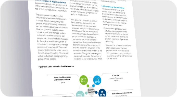 20 The Metaverse Overview : Vision, Technology, and Tactics | Vision and Values Metaverse Experience Promote Real World Efficiency Enter the Metaverse with Entertainment Education Shopping Trade Virtual Community game Creative Collaboration Platform A 2nd Life New Influence & Social Status New Income right to use or own all or part of these virtual creations. In contrast, the real, centralized world allows any game prop to be copied at almost zero cost. Characteristics 6: Big uncertainty Governance structure is the core issue in the Metaverse, that is, who will be on top of its future governance structure. The governance structure in the Metaverse is interlaced. One scenario is virtual worlds managed by real people. Most of the early Metaverse worlds had this governance structure. Real people write code to create virtual worlds and manage avatars in them. In another scenario, real people are constrained and managed by the virtual world, with groups of virtual world managers who manage people in the real world. This small group establishes the rules, controls the virtual world and its citizens, with virtual individuals managing a large group of real people. Who will top the Metaverse governance structure in future? AI is at the root of this problem—will human beings rule robots or will we eventually create robots that surpass human beings? It is probably not the original intention, but AI self-learning could make robots eventually surpass human intelligence, giving them the ability to rule the world. This governance issue is so critical because the virtual world of the Metaverse carries has enormous economic and political power. Some prototypes of the Metaverse, such as online game purchases of virtual props, community purchases of real estate, and virtual currency transactions, have already shown the economic power of the virtual world, and this power will only grow. At the same time, the number of users of the products of the global internet giants has already exceeded the number of residents of any single country. When designing the Metaverse, all creators will need to decide who has the final say in the virtual world and who owns its economic benefits. 1.3 The value of the Metaverse The Metaverse can bring tangible value to people and the real world. This is the fundamental driver of the Metaverse wave. In the end, the value the Metaverse will bring to people is multifaceted, spiritual and material, including five main elements: • Entertainment: games and social activities, where players enter the Metaverse to enjoy immersive and realistic interactions, resulting in a pleasant experience of games and socializing • A second Life: collaboration platforms where creators build their own personal worlds in a virtual space, giving individuals the opportunity to experience a life that is different from the real world Figure17: User value in the Metaverse Source: Deloitte analysis