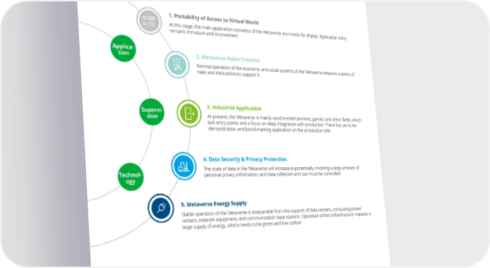 22 The Metaverse Overview : Vision, Technology, and Tactics | Vision and Values Figure18: The five major Metaverse bottlenecks Source: Public information, Deloitte analysis 1. Portability of Access to Virtual World At this stage, the main application scenarios of the Metaverse are mostly for display. Application entry remains immature and inconvenient 5. Metaverse Energy Supply Stable operation of the Metaverse is inseparable from the support of data centers, computing power centers, network equipment, and communication base stations. Operation of this infrastructure requires a large supply of energy, which needs to be green and low-carbon 2. Metaverse Rules Creation Normal operation of the economic and social systems of the Metaverse requires a series of rules and institutions to support it 4. Data Security & Privacy Protection The scale of data in the Metaverse will increase exponentially, involving a large amount of personal privacy information, and data collection and use must be controlled 3. Industrial Application At present, the Metaverse is mainly used in entertainment, games, and other fields, which lack entry points and a focus on deep integration with production. There has yet to be demonstration and benchmarking application on the production side Applica- tion Supervi- sion Technol- ogy