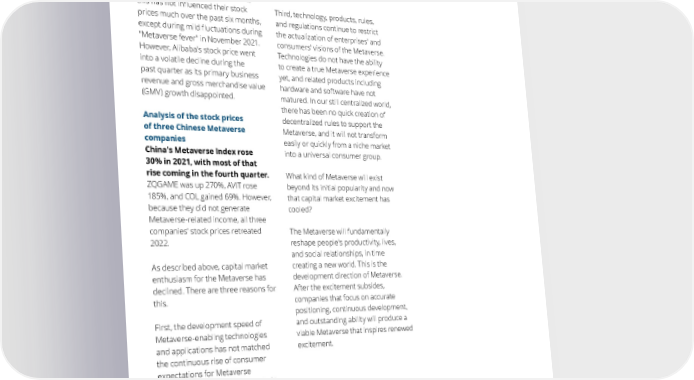 08 The Metaverse Overview : Vision, Technology, and Tactics | Preface Analysis of the stock prices of three leading Chinese technology companies Although Baidu, Alibaba, and Tencent have all deployed in the Metaverse, this has not influenced their stock prices much over the past six months, except during mild fluctuations during "Metaverse fever" in November 2021. However, Alibaba's stock price went into a volatile decline during the past quarter as its primary business revenue and gross merchandise value (GMV) growth disappointed. Analysis of the stock prices of three Chinese Metaverse companies China's Metaverse Index rose 30% in 2021, with most of that rise coming in the fourth quarter. ZQGAME was up 270%, AVIT rose 185%, and COL gained 69%. However, because they did not generate Metaverse-related income, all three companies' stock prices retreated 2022. As described above, capital market enthusiasm for the Metaverse has declined. There are three reasons for this. First, the development speed of Metaverse-enabling technologies and applications has not matched the continuous rise of consumer expectations for Metaverse applications. This year is expected to see a continuation of that trend, with Metaverse development throughout the year slower than the public expects. Second, most Metaverse practices, intending to cater to the Metaverse craze, remain at the conceptual stage. It is difficult to achieve far-reaching breakthroughs or returns on capital investment at speed. Third, technology, products, rules, and regulations continue to restrict the actualization of enterprises' and consumers' visions of the Metaverse. Technologies do not have the ability to create a true Metaverse experience yet, and related products including hardware and software have not matured. In our still centralized world, there has been no quick creation of decentralized rules to support the Metaverse, and it will not transform easily or quickly from a niche market into a universal consumer group. What kind of Metaverse will exist beyond its initial popularity and now that capital market excitement has cooled? The Metaverse will fundamentally reshape people's productivity, lives, and social relationships, in time creating a new world. This is the development direction of Metaverse. After the excitement subsides, companies that focus on accurate positioning, continuous development, and outstanding ability will produce a viable Metaverse that inspires renewed excitement.