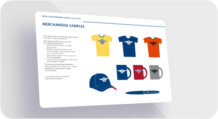 DELTA FLIGHT MUSEUM: BRAND STYLE GUIDE 10 MERCHANDISE SAMPLES The examples shown here illustrate the application of the DFM logo to promotional merchandise. NAME: NAME:When applying the DFM logo to promotional items, please follow these rules: • Always apply the DFM logo in one of the approved colors. • Maintain the quality and resolution of the DFM logo regardless of the production method (e.g., printing, embroidery). • Never place the signature within a shape or on a patterned background. • Size the DFM logo appropriately in relation to the item for maximum visibility. The selection and quality of promotional items says a lot about our brand. Therefore, it is important NAME: to select items that align with our desired brand personality. The examples shown on this page are for demonstration purposes only. NAME: