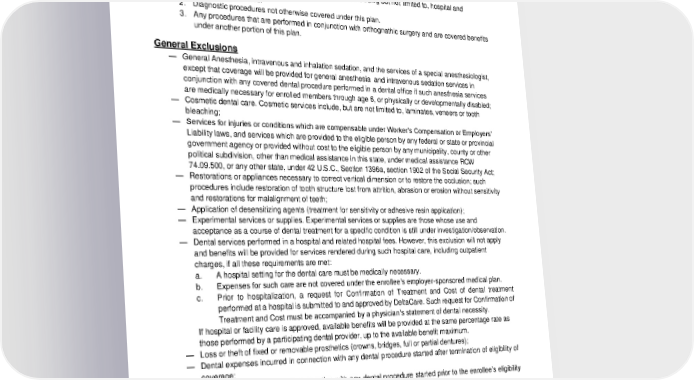 15. Composite bands and lingual adaptation of orthodontic bands are considered optional treatment and would be subject to additional charges. *Phase I is defined as early treatment including interceptive orthodontia prior to the development of late mixed dentition. Orthognathic Surgery Limitations 1. Services that would be provided under medical care including but not limited to, hospital and professional services. 2. Diagnostic procedures not otherwise covered under this plan. 3. Any procedures that are performed in conjunction with orthognathic surgery and are covered benefits under another portion of this plan. General Exclusions — General Anesthesia, intravenous and inhalation sedation, and the services of a special anesthesiologist, except that coverage will be provided for general anesthesia and intravenous sedation services in conjunction with any covered dental procedure performed in a dental office if such anesthesia services are medically necessary for enrolled members through age 6, or physically or developmentally disabled; — Cosmetic dental care. Cosmetic services include, but are not limited to, laminates, veneers or tooth bleaching; — Services for injuries or conditions which are compensable under Worker’s Compensation or Employers’ Liability laws, and services which are provided to the eligible person by any federal or state or provincial government agency or provided without cost to the eligible person by any municipality, county or other political subdivision, other than medical assistance in this state, under medical assistance RCW 74.09.500, or any other state, under 42 U.S.C., Section 1396a, section 1902 of the Social Security Act; — Restorations or appliances necessary to correct vertical dimension or to restore the occlusion; such procedures include restoration of tooth structure lost from attrition, abrasion or erosion without sensitivity and restorations for malalignment of teeth; — Application of desensitizing agents (treatment for sensitivity or adhesive resin application); — Experimental services or supplies. Experimental services or supplies are those whose use and acceptance as a course of dental treatment for a specific condition is still under investigation/observation. — Dental services performed in a hospital and related hospital fees. However, this exclusion will not apply and benefits will be provided for services rendered during such hospital care, including outpatient charges, if all these requirements are met: a. A hospital setting for the dental care must be medically necessary. b. Expenses for such care are not covered under the enrollee’s employer-sponsored medical plan. c. Prior to hospitalization, a request for Confirmation of Treatment and Cost of dental treatment performed at a hospital is submitted to and approved by DeltaCare. Such request for Confirmation of Treatment and Cost must be accompanied by a physician’s statement of dental necessity. If hospital or facility care is approved, available benefits will be provided at the same percentage rate as those performed by a participating dental provider, up to the available benefit maximum. — Loss or theft of fixed or removable prosthetics (crowns, bridges, full or partial dentures); — Dental expenses incurred in connection with any dental procedure started after termination of eligibility of coverage; — Dental expenses incurred in connection with any dental procedure started prior to the enrollee’s eligibility (except for Orthodontic treatment plans transferred to DDWA from Willamette); — Cysts and malignancies; — Laboratory examination of tissue specimen; Laboratory tests and laboratory exams; 2024-01-03100-BB 20 DCL 20240101