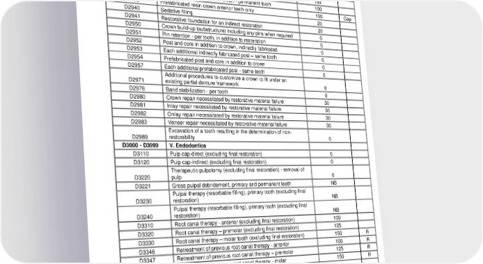 Procedure Description Copayment Notes Re-cement or rebond indirectly fabricated or prefabricated post D2915 and core 0 D2920 Re-cement or rebond crown 0 D2921 Reattachment of tooth fragment, incisal edge or cusp 15 D2930 Prefabricated stainless steel crown - primary tooth 100 D2931 Prefabricated stainless steel crown - permanent tooth 100 D2932 Prefabricated resin crown anterior teeth only 100 Gap D2940 Sedative filling 20 D2941 Restorative foundation for an indirect restoration 20 D2950 Crown build-up (substructure) including any pins when required 0 D2951 Pin retention - per tooth, in addition to restoration 0 D2952 Post and core in addition to crown, indirectly fabricated 0 D2953 Each additional indirectly fabricated post – same tooth 0 D2954 Prefabricated post and core in addition to crown 0 D2957 Each additional prefabricated post - same tooth 0 Additional procedures to customize a crown to fit under an D2971 existing partial denture framework 0 D2976 Band stabilization - per tooth 0 D2980 Crown repair necessitated by restorative material failure 30 D2981 Inlay repair necessitated by restorative material failure 30 D2982 Onlay repair necessitated by restorative material failure 30 D2983 Veneer repair necessitated by restorative material failure 30 Excavation of a tooth resulting in the determination of non- D2989 restorability 0 D3000 - D3999 V. Endodontics D3110 Pulp cap-direct (excluding final restoration) 0 D3120 Pulp cap-indirect (excluding final restoration) 0 Therapeutic pulpotomy (excluding final restoration) - removal of D3220 pulp 0 D3221 Gross pulpal debridement, primary and permanent teeth NB Pulpal therapy (resorbable filling), primary tooth (excluding final D3230 restoration) NB Pulpal therapy (resorbable filling), primary tooth (excluding final D3240 restoration) NB D3310 Root canal therapy - anterior (excluding final restoration) 100 D3320 Root canal therapy – premolar (excluding final restoration) 125 D3330 Root canal therapy – molar tooth (excluding final restoration) 150 R D3346 Retreatment of previous root canal therapy - anterior 100 R D3347 Retreatment of previous root canal therapy – premolar 125 R D3348 Retreatment of previous root canal therapy - molar 150 R Apexification/recalcification – initial visit (apical closure / calcific repair of perforations, root resorption, pulp space disinfection, D3351 etc.) 10 R D3352 Apexification/recalcification - interim visit 10 R D3353 Apexification/recalcification - final visit 10 R D3410 Apicoectomy – anterior 70 R D3421 Apicoectomy – premolar (first root) 50 R 2024-01-03100-BB 9 DCL 20240101