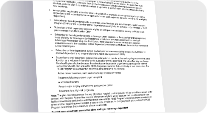 • Subscriber has a change in employment status that affects their eligibility for the employer contribution toward their employer-based group health plan. • Subscriber’s dependent has a change in their own employment status that affects their eligibility or their dependent’s eligibility for the employer contribution under their employer-based group health plan. “Employer contribution” means contributions made by the dependent’s current or former employer toward health coverage as described in the Treasury Regulation. • Subscriber or their dependent has a change in residence that affects health plan availability. If the subscriber moves and their current health plan is not available in the new location, the subscriber must select a new health plan, otherwise there will be limited accessibility to network providers and covered services. A dental plan is considered available if a provider is located within 50 miles of the subscriber’s new residence. • A court order requires the subscriber or any other individual to provide insurance coverage for an eligible dependent of the subscriber (a former spouse or former state-registered domestic partner is not an eligible dependent). • Subscriber or their dependent enrolls in coverage under Medicaid or a state Children’s Health Insurance Program (CHIP) or the subscriber or their dependent loses eligibility for coverage under Medicaid or CHIP. • Subscriber or their dependent becomes eligible for state premium assistance subsidy for PEBB health plan coverage from Medicaid or CHIP. • Subscriber or their dependent enrolls in coverage under Medicare, or the subscriber or their dependent loses eligibility for coverage under Medicare or enrolls in or terminates enrollment in a Medicare Advantage-Prescription Drug or a Part D plan. If the subscriber’s current medical plan becomes unavailable due to the subscriber or their dependent’s enrollment in Medicare, the subscriber must select a new medical plan. • Subscriber or their dependent’s current medical plan becomes unavailable because the subscriber or enrolled dependent is no longer eligible for a health savings account (HSA). • Subscriber or their dependent experiences a disruption of care for active and ongoing treatment that could function as a reduction in benefits for the subscriber or their dependent. The subscriber may not change their health plan election because the subscriber or dependent’s physician stops participation with the subscriber’s health plan unless the PEBB Program determines that a continuity of care issue exists. The PEBB Program will consider but not limit its consideration to the following: Active cancer treatment, such as chemotherapy or radiation therapy Treatment following a recent organ transplant A scheduled surgery Recent major surgery still within the postoperative period Treatment for a high-risk pregnancy Note: The plan cannot guarantee that any physician, hospital, or other provider will be available or remain under contract with the plan. An enrollee may not change dental plans simply because their provider or health care facility discontinues participation with this dental plan until the PEBB Program’s next annual open enrollment or when another qualifying event creates a special open enrollment for changing health plans, unless the PEBB Program determines that a continuity of care issue exists. Special open enrollment events that allow adding or removing a dependent Any of the following events may create a special open enrollment: • Subscriber gains a new dependent due to: Marriage or registering a state-registered domestic partnership. Birth, adoption, or when the subscriber has assumed a legal obligation for total or partial support in anticipation of adoption. A child becoming eligible as an extended dependent through legal custody or legal guardianship. 2024-01-03100-BB 31 DCL 20240101