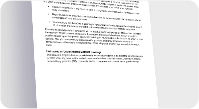Enrollees may be required to provide DeltaCare or the HCA with information necessary to determine eligibility, administer benefits or process claims. This could include, but is not limited to, dental records. Coverage could be denied if enrollees fail to provide such information when requested. When a Third Party is Responsible for Injury or Illness (Subrogation) To the extent of any amounts paid by DeltaCare for an eligible person on account of services made necessary by an injury to or condition of his or her person, DeltaCare shall be subrogated to his or her rights against any third party liable for the injury or condition. DeltaCare shall, however, not be obligated to pay for such services unless and until the eligible person, or someone legally qualified and authorized to act for him or her, agrees to: • Include those amounts in any insurance claim or in any liability claim made against the third party for the injury or condition; • Repay DDWA those amounts included in the claim from the excess received by the injured party, after full compensation for the loss is received; • Cooperate fully with DeltaCare in asserting its rights under the Contract, to supply DeltaCare with any and all information and execute any and all instruments DeltaCare reasonably needs for that purpose. Provided the injured party is in compliance with the above, DeltaCare will prorate any attorneys' fees incurred in the recovery. What this means to you is that if you receive this program's benefits for an injury or condition possibly caused by another person, you must include in your insurance claim or liability claim the amount of those benefits. After you have been fully compensated for your loss, any money recovered in excess of full compensation must be used to reimburse DDWA. DDWA will prorate any attorneys' fees against the amount owed. Uninsured or Underinsured Motorist Coverage This DeltaCare program does not provide benefits for services or supplies to the extent that benefits are payable for them under any motor vehicle medical, motor vehicle no-fault, uninsured motorist, underinsured motorist, personal injury protection (PIP), commercial liability, homeowner's policy or other similar type of coverage. 2024-01-03100-BB 35 DCL 20240101