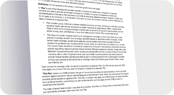 When the Member Has Other Dental Coverage Coordination of This Contract's Benefits with Other Benefits: The coordination of benefits (COB) provision applies when you have dental coverage under more than one Plan. Plan is defined below. The order of benefit determination rules govern the order in which each Plan will pay a claim for benefits. The Plan that pays first is called the Primary Plan. The Primary Plan must pay benefits according to its policy terms without regard to the possibility that another Plan may cover some expenses. The Plan that pays after the Primary Plan is the Secondary Plan. The Secondary Plan may reduce the benefits it pays so that payments from all Plans do not exceed 100 percent of the total Allowable Expense. Definitions: For the purpose of this section, the following definitions shall apply: A “Plan” is any of the following that provides benefits or services for dental care or treatment. If separate contracts are used to provide coordinated coverage for members of a group, the separate contracts are considered parts of the same Plan and there is no COB among those separate contracts. However, if COB rules do not apply to all contracts, or to all benefits in the same contract, the contract or benefit to which COB does not apply is treated as a separate Plan. ▪ Plan includes: group, individual or blanket disability insurance contracts, and group or individual contracts issued by health care service contractors or health maintenance organizations (HMO), Closed Panel Plans or other forms of group coverage; medical care components of long-term care contracts, such as skilled nursing care; and Medicare or any other federal governmental Plan, as permitted by law. ▪ Plan does not include: hospital indemnity or fixed payment coverage or other fixed indemnity or fixed payment coverage; accident only coverage; specified disease or specified accident coverage; limited benefit health coverage, as defined by state law; school accident and similar coverage that cover students for accidents only, including athletic injuries, either on a twenty-four-hour basis or on a "to and from school" basis; benefits for nonmedical components of long-term care policies; automobile insurance policies required by statute to provide medical benefits; Medicare supplement policies; A state plan under Medicaid; A governmental plan, which, by law, provides benefits that are in excess of those of any private insurance plan or other nongovernmental plan; automobile insurance policies required by statute to provide medical benefits; benefits provided as part of a direct agreement with a direct patient-provider primary care practice as defined by law or coverage under other federal governmental Plans, unless permitted by law. Each contract for coverage under the above bullet points is a separate Plan. If a Plan has two parts and COB rules apply only to one of the two, each of the parts is treated as a separate Plan. “This Plan” means, in a COB provision, the part of the contract providing the dental benefits to which the COB provision applies and which may be reduced because of the benefits of other Plans. Any other part of the contract providing dental benefits is separate from This Plan. A contract may apply one COB provision to certain benefits, such as dental benefits, coordinating only with similar benefits, and may apply another COB provision to coordinate other benefits. The order of benefit determination rules determine whether This Plan is a Primary Plan or Secondary Plan when you have dental coverage under more than one Plan. 2024-01-03100-BB 38 DCL 20240101