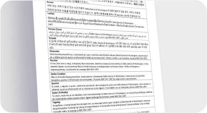 Taglines German Falls Sie oder jemand, dem Sie helfen, Fragen zu Delta Dental of Washington haben, sind Sie berechtigt, kostenlos Hilfe und Informationen in Ihrer Sprache zu erhalten. Um mit einem Dolmetscher zu sprechen, rufen Sie bitte die Nummer 800-554-1907 an. Japanese ご本人様、またはお客様の身寄りの方でもDelta Dental of Washingtonについてご質問がございましたら、ご希 望の言語でサポートを受けたり、情報を入手したりすることができます。料金はかかりません。通訳とお話さ れる場合 800-554-1907までお電話ください。 Korean 귀하 또는 귀하가 돕고 있는 누군가에게 Delta Dental of Washington에 대한 질문이 있을 경우, 귀하는 무료로 귀하의 언어로 도움을 제공받을 권리가 있습니다. 통역사와 통화를 원하시면 800-554-1907로 전화하십시오. Laotian ່ ່ ຖາທານ ຫ ບກຄນໃດໜງທທານກາລງໃຫການຊວຍເຫ ອມຄາຖາມກຽວກບ Delta Dental of Washington, ຸ ້ ່ ່ ໍ ້ ່ ໍ ່ ຼື ຼື ົ ັ ັ ່ ້ ່ ທານມສດໄດຮບຄວາມຊວຍເຫ ອ ແລະ ຂມນເປນພາສາຂອງທານໂດຍບເສຍຄາ. ເພອລມກບຜແປພາສາ, ໂທ 800-554- ູ ູ ່ ້ ່ ໍ ັ ່ ໍ ່ ້ ິ ຼື ຼື ັ ົ ັ 1907. Persian (Farsi) یه رابرد لىاؤس ،دینکم کمک یو هب هک صیخش ای ،امش رگاDelta Dental of Washington نابز هب ار ناتزاین دروم تاعلاطا هک دیراد ار قح نیا ،دراد ر . . دینک تفایرد یاه نیزه چیه نودب و دوخ هرامش اب ،هیافش مجتم کی اب تبحص تهج 800-554-1907 دیتگب سامت ر Punjabi ਾਂ ਜੇ ਤੁਹਾਡੇ ਜਾ ਾਂ ਜਜਸ ਦੀ ਤੁਸੀ ਸਹਾਇਤਾ ਕਰ ਰਹੇ ਹੋ ਉਸ ਦੇ, Delta Dental of Washington ਬਾਰੇ ਕੋਈ ਪ੍ਰਸ਼ਨ ਹਨ, ਤਾਾਂ ਤੁਹਾਨੂੰ ਜਬਨਾਾਂ ਜਕਸੇ ਕੀਮਤ ਦੇ ਆਪ੍ਣੀ ਭਾਸ਼ਾ ਜਿਚ ਸਹਾਇਤਾ ਅਤੇ ਜਾਣਕਾਰੀ ਪ੍ਰਾਪ੍ਤ ਕਰਨ ਦਾ ਅਜਿਕਾਰ ਹੈ। ਦਭੁ ਾਸ਼ੀਏ ਨਾਲ ਗਲੱ ਕਰਨ ਲਈ, 800-554-1907 ‘ਤੇ ਕਾਲ ਕਰੋ। Romanian Dacă dumneavoastră sau o persoană pe care o asistați aveți întrebări despre Delta Dental of Washington, aveți dreptul de a obține gratuit ajutor și informații în limba dumneavoastră. Pentru a vorbi cu un interpret, sunați la 800-554-1907. Russian Если у Вас или у лица, которому Вы помогаете, имеются вопросы относительно Delta Dental of Washington, то Вы имеете право на получение бесплатной помощи и информации на Вашем языке. Чтобы поговорить с переводчиком, позвоните по номеру 800-554-1907. Serbo-Croatian Ako vi, ili osoba kojoj pomažete, imate pitanja o kompaniji Delta Dental of Washington, imate pravo da potražite besplatnu pomoć i informacije na svom jeziku. Pozovite 800-554-1907 da razgovarate s prevodiocem. Spanish Si usted, o alguien a quien usted está ayudando, tiene preguntas acerca de Delta Dental of Washington, tiene derecho a obtener ayuda e información en su idioma sin costo alguno. Para hablar con un intérprete, llame al 800-554-1907. Sudan (Fulfulde) To onon, mala mo je on mballata, don mari emmmolji do Delta Dental of Washington, on mari jarfuye keɓɓugo wallende be matinolji be wolde moɗon mere. Ngam wolwugo be lornowo, ewne 800-554-1907. Tagalog Kung ikaw, o isang taong tinutulungan mo, ay may mga katanungan tungkol sa Delta Dental of Washington, mayroon kang karapatan humingi ng tulong at impormasyon sa iyong wika nang walang bayad. Upang makipag-usap sa isang tagasalin-wika, tumawag sa 800-554-1907. Ukrainian Якщо у Вас або у когось, кому Ви допомагаєте, є запитання щодо Delta Dental of Washington, Ви маєте право безкоштовно отримати допомогу та інформацію Вашою мовою. Щоб поговорити з перекладачем, телефонуйте за номером 800-554-1907. Vietnamese Nếu quý vị, hoặc ai đó mà quý vị đang giúp đỡ, có thắc mắc về Delta Dental of Washington, quý vị có quyền được nhận trợ giúp và thông tin bằng ngôn ngữ của mình miễn phí. Để nói chuyện với thông dịch viên, hãy gọi 800-554-1907. 2024-01-03100-BB 45 DCL 20240101