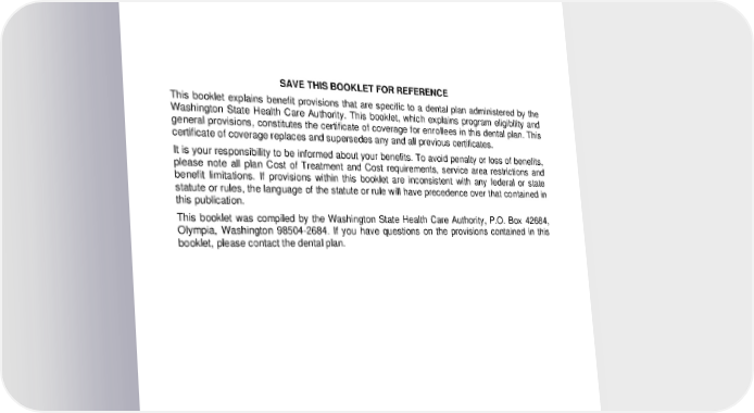 SAVE THIS BOOKLET FOR REFERENCE This booklet explains benefit provisions that are specific to a dental plan administered by the Washington State Health Care Authority. This booklet, which explains program eligibility and general provisions, constitutes the certificate of coverage for enrollees in this dental plan. This certificate of coverage replaces and supersedes any and all previous certificates. It is your responsibility to be informed about your benefits. To avoid penalty or loss of benefits, please note all plan Cost of Treatment and Cost requirements, service area restrictions and benefit limitations. If provisions within this booklet are inconsistent with any federal or state statute or rules, the language of the statute or rule will have precedence over that contained in this publication. This booklet was compiled by the Washington State Health Care Authority, P.O. Box 42684, Olympia, Washington 98504-2684. If you have questions on the provisions contained in this booklet, please contact the dental plan. 2024-01-03100-BB ii DCL 20240101