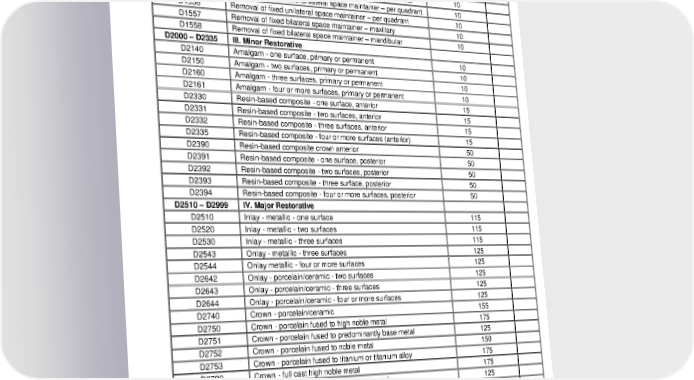 Procedure Description Copayment Notes D1520 Space maintainer - removable, unilateral – per quadrant 20 D1526 Space maintainer - removable, bilateral, maxillary 30 D1527 Space maintainer - removable, bilateral, mandibular 30 D1551 Re-cement or re-bond bilateral space maintainer – maxillary 10 D1552 Re-cement or re-bond bilateral space maintainer – mandibular 10 D1553 Re-cement or re-bond unilateral space maintainer – per quadrant 10 D1556 Removal of fixed unilateral space maintainer – per quadrant 10 D1557 Removal of fixed bilateral space maintainer – maxillary 10 D1558 Removal of fixed bilateral space maintainer – mandibular 10 D2000 – D2335 III. Minor Restorative D2140 Amalgam - one surface, primary or permanent 10 D2150 Amalgam - two surfaces, primary or permanent 10 D2160 Amalgam - three surfaces, primary or permanent 10 D2161 Amalgam - four or more surfaces, primary or permanent 10 D2330 Resin-based composite - one surface, anterior 15 D2331 Resin-based composite - two surfaces, anterior 15 D2332 Resin-based composite - three surfaces, anterior 15 D2335 Resin-based composite - four or more surfaces (anterior) 15 D2390 Resin-based composite crown anterior 50 D2391 Resin-based composite - one surface, posterior 50 D2392 Resin-based composite - two surfaces, posterior 50 D2393 Resin-based composite - three surface, posterior 50 D2394 Resin-based composite - four or more surfaces, posterior 50 D2510 – D2999 IV. Major Restorative D2510 Inlay - metallic - one surface 115 D2520 Inlay - metallic - two surfaces 115 D2530 Inlay - metallic - three surfaces 115 D2543 Onlay - metallic - three surfaces 125 D2544 Onlay metallic - four or more surfaces 125 D2642 Onlay - porcelain/ceramic - two surfaces 125 D2643 Onlay - porcelain/ceramic - three surfaces 125 D2644 Onlay - porcelain/ceramic - four or more surfaces 125 D2740 Crown - porcelain/ceramic 155 D2750 Crown - porcelain fused to high noble metal 175 D2751 Crown - porcelain fused to predominantly base metal 125 D2752 Crown - porcelain fused to noble metal 150 D2753 Crown - porcelain fused to titanium or titanium alloy 175 D2790 Crown - full cast high noble metal 175 D2791 Crown - full cast predominantly base metal 125 D2792 Crown - full cast noble metal 150 D2794 Crown – titanium/titanium alloy 175 D2799 Interim crown 125 Recement or rebond inlay, onlay, veneer or partial coverage D2910 restorations 0 2024-01-03100-BB 8 DCL 20240101