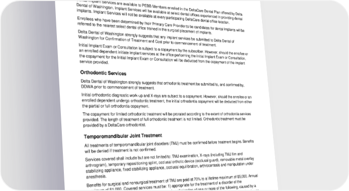 These services do not include and do not cover: 1. Personalized restoration, precision attachments and special techniques. 2. Replacement of an existing denture, crown or bridge less than five years after the date of the most recent placement. 3. Denture replacements made necessary by loss, theft or breakage. Implant Services Dental implant Services are available to PEBB Members enrolled in the DeltaCare Dental Plan offered by Delta Dental of Washington. Implant Services will be available at select dental offices experienced in providing dental implants. Implant Services will not be available at every participating DeltaCare dental office location. Enrollees who have been determined by their Primary Care Provider to be candidates for dental implants will be referred to the nearest select dental office trained in the surgical placement of implants. Delta Dental of Washington strongly suggests that any implant services be submitted to Delta Dental of Washington for Confirmation of Treatment and Cost prior to commencement of treatment. Initial Implant Exam or Consultation is subject to a copayment by the subscriber. However, should the enrollee or an enrolled dependent initiate implant services at the office performing the initial Implant Exam or Consultation, the copayment for the Initial Implant Exam or Consultation will be deducted from the copayment of the implant service provided. Orthodontic Services Delta Dental of Washington strongly suggests that orthodontic treatment be submitted to, and confirmed by, DDWA prior to commencement of treatment. Initial orthodontic diagnostic work-up and X-rays are subject to a copayment. However, should the enrollee or an enrolled dependent undergo orthodontic treatment, the initial orthodontia copayment will be deducted from either the partial or full orthodontia copayment. The copayment for limited orthodontic treatment will be prorated according to the extent of orthodontia services provided. The length of treatment of full orthodontic treatment is not limited. Orthodontic treatment must be provided by a DeltaCare orthodontist. Temporomandibular Joint Treatment All treatments of temporomandibular joint disorders (TMJ) must be confirmed before treatment begins. Benefits will be denied if treatment is not confirmed. Services covered shall include but are not limited to: TMJ examination, X-rays (including TMJ film and arthrogram), temporary repositioning splint, occlusal orthotic device (occlusal guard), removable metal overlay stabilizing appliance, fixed stabilizing appliance, occlusal equilibration, arthrocentesis and manipulation under anesthesia. Benefits for surgical and nonsurgical treatment of TMJ are paid at 70% to a lifetime maximum of $5,000. Annual maximum of $1,000. Covered services must be: 1) appropriate for the treatment of a disorder of the temporomandibular joint; 2) effective for the control or elimination of one or more of the following, caused by a disorder of the temporomandibular joint: pain, infection, disease, difficulty in speaking, or difficulty in chewing or swallowing food; 3) recognized as effective, according to the professional standards of good dental practice; 4) not investigational; and 5) not primarily for cosmetic purposes. All services must be provided or ordered by the enrolleeās dentist. Any procedures that are performed in conjunction with TMJ services, and are covered benefits under another portion of the dental plan, are not covered under this portion. 2024-01-03100-BB 16 DCL 20240101