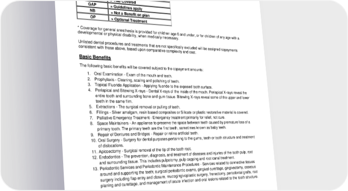 Procedure Description Copayment Notes Dental case management – patients with special health care D9997 needs NB = Confirmation of Treatment and C Cost recommended R = Referable to a specialist TMJ = TMJ Covered GAP = Guidelines apply NB = Not a Benefit on plan OP = Optional Treatment * Coverage for general anesthesia is provided for children age 6 and under, or for children of any age with a developmental or physical disability, when medically necessary. Unlisted dental procedures and treatments that are not specifically excluded will be assigned copayments consistent with those above, based upon comparative complexity and cost. Basic Benefits The following basic benefits will be covered subject to the copayment amounts: 1. Oral Examination - Exam of the mouth and teeth. 2. Prophylaxis - Cleaning, scaling and polishing of teeth. 3. Topical Fluoride Application - Applying fluoride to the exposed tooth surface. 4. Periapical and Bitewing X-rays - Dental X-rays of the inside of the mouth. Periapical X-rays reveal the entire tooth and surrounding bone and gum tissue. Bitewing X-rays reveal some of the upper and lower teeth in the same film. 5. Extractions - The surgical removal or pulling of teeth. 6. Fillings - Silver amalgam, resin based composites or Silicate or plastic restorative material is covered. 7. Palliative Emergency Treatment - Emergency treatment primarily for relief, not cure. 8. Space Maintainers - An appliance to preserve the space between teeth caused by premature loss of a primary tooth. The primary teeth are the first teeth, sometimes known as baby teeth. 9. Repair of Dentures and Bridges - Repair or reline artificial teeth. 10. Oral Surgery - Surgery for dental purposes pertaining to the gums, teeth or tooth structure and treatment of dislocations. 11. Apicoectomy - Surgical removal of the tip of the tooth root. 12. Endodontics - The prevention, diagnosis, and treatment of diseases and injuries of the tooth pulp, root and surrounding tissue. This includes pulpotomy, pulp capping and root canal treatment. 13. Periodontic Services and Periodontic Maintenance Procedures - Services related to connective tissues around and supporting the teeth; surgical periodontic exams, gingival curettage, gingivectomy, osseous surgery including flap entry and closure, mucogingivoplastic surgery, frenectomy, periodontal grafts, root planing and curettage, and management of acute infection and oral lesions related to the tooth structure. Prosthodontic Services Dentures, bridges, partial dentures, related items — including crowns placed on dental implants — and the adjustment or repair of an existing prosthetic device are covered under this benefit. Replacement of missing teeth with full or partial dentures, crowns or bridges is limited to the charge for the standard procedure. 2024-01-03100-BB 15 DCL 20240101