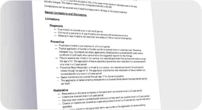 Orthognathic Surgery All orthognathic treatment must be authorized before treatment begins. Benefits will be denied if a Confirmation of Treatment and Cost is not confirmed. Orthognathic treatment performed by a licensed dentist or physician is defined as the necessary surgical procedures or treatment to correct the malposition of the maxilla (upper jawbone) and/or the mandible (lower jawbone). Benefits for orthognathic treatment are paid at 70% of the lesser of the maximum allowable fees or the fees actually charged. The lifetime maximum for orthognathic benefits is $5,000. Complications will be covered only if treatment begins within 30 days of the original treatment. Dental Limitations and Exclusions Limitations Diagnostic — Examination is covered once in a 6-month period; — Full mouth or panoramic X-rays limited to one set every 36 consecutive months; — Bitewing X-rays limited to not more than one series of 4 films in any 6-month period; Preventive — Prophylaxis limited to one treatment in a 6-month period. — Topical application of fluoride or fluoride varnish is covered twice in a calendar year. Preventive therapies (e.g., fluoridated varnishes) approved by DeltaCare are a covered benefit under certain conditions of oral health when performed at the suggested regimen for that therapy. — Fissure sealants are limited to non-carious, non-restored permanent first and second molars through the age of 14. The application of fissure sealants or preventive resin restoration is a covered benefit only once in a 3-year period. — Preventive Resin Restoration is limited to non-carious, non-restored permanent first and second molars through the age of 14. The application of preventive resin restoration or fissure sealant is a covered benefit only once in a 3-year period. — Space maintainers are covered through age 17 for the same quadrant. — The application of caries arresting medicament is a Covered Dental Benefit twice per benefit period per tooth. Restorative — Restorations on the same surface(s) of the same tooth are covered once in a 2-year period; — Crowns are covered once in a 5-year period; — Stainless steel crowns or prefabricated crowns on primary teeth are covered once in a 2-year period; — Crowns on implants are covered as a specialty procedure once in a 5 year period, may be referred to specialist. — Restorations placed on the same tooth within two months of the application of caries arresting medicament are Not a Paid Covered Dental Benefit. Periodontics — Root planing/subgingival curettage is covered once in a 12-month period; — Limited occlusal adjustments are covered once in a 12-month period; — Site specific therapies (localized delivery of antimicrobial agents) are a covered benefit under certain conditions of oral health such as your gums have pocket depth readings of 5mm (or greater); — Periodontal surgery is covered once in a 3-year period; 2024-01-03100-BB 17 DCL 20240101