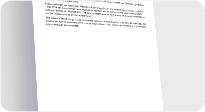 Communication Access Assistance For Individuals who are Deaf, Hard of Hearing, Deaf-blind or Speech-disabled Communications with DDWA for people who are deaf, hard of hearing, deaf-blind and/or speech disabled is available through Washington Relay Service. This is a free telecommunications relay service provided by the Washington State Office of the Deaf and Hard of Hearing. The relay service allows individuals who use a Teletypewriter (TTY) to communicate with DDWA through specially trained communications assistants. Anyone wishing to use Washington Relay Service can simply dial 711 (the statewide telephone relay number) or 1-800-833-6384 to connect with a communications assistant. Ask the communications assistant to dial DDWA Customer Service at 1-800-554-1907. The communications assistant will then relay the conversation between you and the DDWA customer service representative. This service is free of charge in local calling areas. Calls can be made anywhere in the world, 24 hours a day, 365 days a year, with no restrictions on the number, length or type of calls. All calls are confidential, and no records of any conversation are maintained. 2024-01-03100-BB 6 DCL 20240101