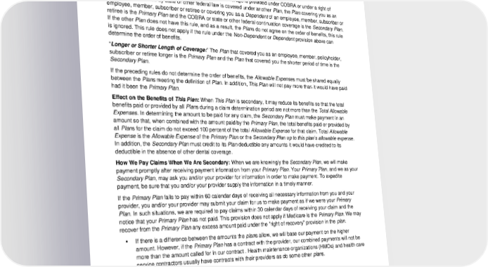 “Active Employee or Retired or Laid-off Employee:” The Plan that covers you as an active employee, that is, an employee who is neither laid off nor retired, is the Primary Plan. The Plan covering you as a retired or laid-off employee is the Secondary Plan. The same would hold true if you are a Dependent of an active employee and you are a Dependent of a retired or laid-off employee. If the other Plan does not have this rule, and as a result, the Plans do not agree on the order of benefits, this rule is ignored. This rule does not apply if the rule under the Non-Dependent or Dependent provision above can determine the order of benefits. “COBRA or State Continuation Coverage:” If your coverage is provided under COBRA or under a right of continuation provided by state or other federal law is covered under another Plan, the Plan covering you as an employee, member, subscriber or retiree or covering you as a Dependent of an employee, member, subscriber or retiree is the Primary Plan and the COBRA or state or other federal continuation coverage is the Secondary Plan. If the other Plan does not have this rule, and as a result, the Plans do not agree on the order of benefits, this rule is ignored. This rule does not apply if the rule under the Non-Dependent or Dependent provision above can determine the order of benefits. “Longer or Shorter Length of Coverage:” The Plan that covered you as an employee, member, policyholder, subscriber or retiree longer is the Primary Plan and the Plan that covered you the shorter period of time is the Secondary Plan. If the preceding rules do not determine the order of benefits, the Allowable Expenses must be shared equally between the Plans meeting the definition of Plan. In addition, This Plan will not pay more than it would have paid had it been the Primary Plan. Effect on the Benefits of This Plan: When This Plan is secondary, it may reduce its benefits so that the total benefits paid or provided by all Plans during a claim determination period are not more than the Total Allowable Expenses. In determining the amount to be paid for any claim, the Secondary Plan must make payment in an amount so that, when combined with the amount paid by the Primary Plan, the total benefits paid or provided by all Plans for the claim do not exceed 100 percent of the total Allowable Expense for that claim. Total Allowable Expense is the Allowable Expense of the Primary Plan or the Secondary Plan up to this plan’s allowable expense. In addition, the Secondary Plan must credit to its Plan deductible any amounts it would have credited to its deductible in the absence of other dental coverage. How We Pay Claims When We Are Secondary: When we are knowingly the Secondary Plan, we will make payment promptly after receiving payment information from your Primary Plan. Your Primary Plan, and we as your Secondary Plan, may ask you and/or your provider for information in order to make payment. To expedite payment, be sure that you and/or your provider supply the information in a timely manner. If the Primary Plan fails to pay within 60 calendar days of receiving all necessary information from you and your provider, you and/or your provider may submit your claim for us to make payment as if we were your Primary Plan. In such situations, we are required to pay claims within 30 calendar days of receiving your claim and the notice that your Primary Plan has not paid. This provision does not apply if Medicare is the Primary Plan. We may recover from the Primary Plan any excess amount paid under the "right of recovery" provision in the plan. ▪ If there is a difference between the amounts the plans allow, we will base our payment on the higher amount. However, if the Primary Plan has a contract with the provider, our combined payments will not be more than the amount called for in our contract . Health maintenance organizations (HMOs) and health care service contractors usually have contracts with their providers as do some other plans. 2024-01-03100-BB 41 DCL 20240101