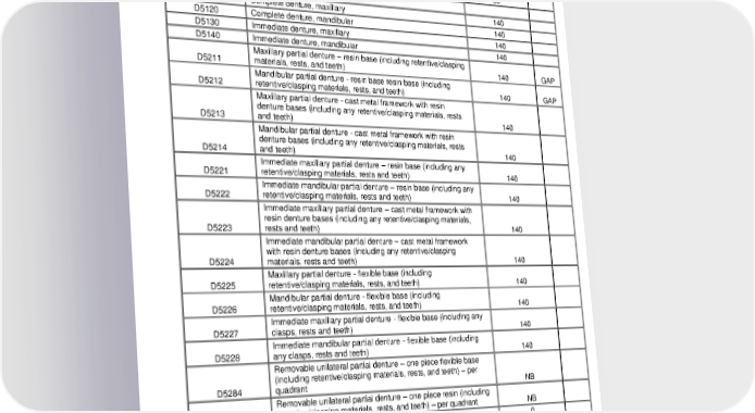 Procedure Description Copayment Notes Full Mouth debridement, once every 12months and diagnosis on D4355 subsequent visit. 25 Localized delivery of antimicrobial agents via a controlled release D4381 vehicle into diseased crevicular tissue, per tooth 0 R D4910 Periodontal maintenance following active therapy 35 D5000 - D5899 VII. Prosthodontics, removable D5110 Complete denture, maxillary 140 D5120 Complete denture, mandibular 140 D5130 Immediate denture, maxillary 140 D5140 Immediate denture, mandibular 140 Maxillary partial denture – resin base (including retentive/clasping D5211 materials, rests, and teeth) 140 GAP Mandibular partial denture - resin base resin base (including D5212 retentive/clasping materials, rests, and teeth) 140 GAP Maxillary partial denture - cast metal framework with resin denture bases (including any retentive/clasping materials, rests D5213 and teeth) 140 Mandibular partial denture - cast metal framework with resin denture bases (including any retentive/clasping materials, rests D5214 and teeth) 140 Immediate maxillary partial denture – resin base (including any D5221 retentive/clasping materials, rests and teeth) 140 Immediate mandibular partial denture – resin base (including any D5222 retentive/clasping materials, rests and teeth) 140 Immediate maxillary partial denture – cast metal framework with resin denture bases (including any retentive/clasping materials, D5223 rests and teeth) 140 Immediate mandibular partial denture – cast metal framework with resin denture bases (including any retentive/clasping D5224 materials, rests and teeth) 140 Maxillary partial denture - flexible base (including D5225 retentive/clasping materials, rests, and teeth) 140 Mandibular partial denture - flexible base (including D5226 retentive/clasping materials, rests, and teeth) 140 Immediate maxillary partial denture - flexible base (including any D5227 clasps, rests and teeth) 140 Immediate mandibular partial denture - flexible base (including D5228 any clasps, rests and teeth) 140 Removable unilateral partial denture – one piece flexible base (including retentive/clasping materials, rests, and teeth) – per D5284 quadrant NB Removable unilateral partial denture – one piece resin (including D5286 retentive/clasping materials, rests, and teeth) – per quadrant NB D5410 Adjust complete denture – maxillary 0 D5411 Adjust complete denture – mandibular 0 D5421 Adjust partial denture – maxillary 0 D5422 Adjust partial denture – mandibular 0 D5512 Repair broken complete denture base, maxillary 15 D5520 Replace missing or broken teeth - complete denture 15 D5612 Repair resin partial denture base, maxillary 15 2024-01-03100-BB 11 DCL 20240101