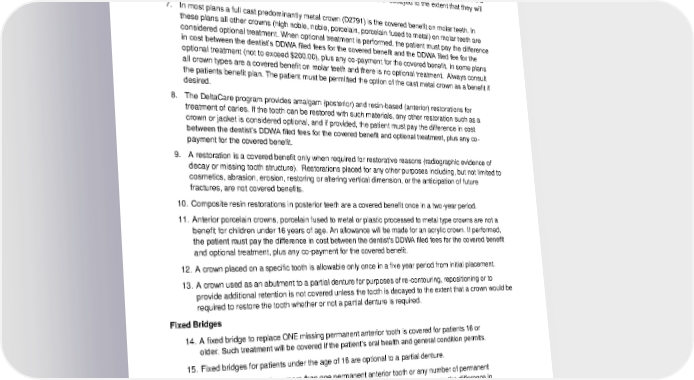 5. Full upper and/or lower dentures are not to exceed one each in any five year period from initial placement. The patient is entitled to a new upper or lower denture only if the existing denture is more than five years old and cannot be made satisfactory by either reline or repair. Fillings and Crowns 6. Crowns will be covered only if there is not enough retention and resistance form left in the tooth to hold a filling. For example, the buccal or lingual walls are either fractured or decayed to the extent that they will not hold a filling. 7. In most plans a full cast predominantly metal crown (D2791) is the covered benefit on molar teeth. In these plans all other crowns (high noble, noble, porcelain, porcelain fused to metal) on molar teeth are considered optional treatment. When optional treatment is performed, the patient must pay the difference in cost between the dentist’s DDWA filed fees for the covered benefit and the DDWA filed fee for the optional treatment (not to exceed $200.00), plus any co-payment for the covered benefit. In some plans all crown types are a covered benefit on molar teeth and there is no optional treatment. Always consult the patients benefit plan. The patient must be permitted the option of the cast metal crown as a benefit if desired. 8. The DeltaCare program provides amalgam (posterior) and resin-based (anterior) restorations for treatment of caries. If the tooth can be restored with such materials, any other restoration such as a crown or jacket is considered optional, and if provided, the patient must pay the difference in cost between the dentist’s DDWA filed fees for the covered benefit and optional treatment, plus any co- payment for the covered benefit. 9. A restoration is a covered benefit only when required for restorative reasons (radiographic evidence of decay or missing tooth structure). Restorations placed for any other purposes including, but not limited to cosmetics, abrasion, erosion, restoring or altering vertical dimension, or the anticipation of future fractures, are not covered benefits. 10. Composite resin restorations in posterior teeth are a covered benefit once in a two-year period. 11. Anterior porcelain crowns, porcelain fused to metal or plastic processed to metal type crowns are not a benefit for children under 16 years of age. An allowance will be made for an acrylic crown. If performed, the patient must pay the difference in cost between the dentist’s DDWA filed fees for the covered benefit and optional treatment, plus any co-payment for the covered benefit. 12. A crown placed on a specific tooth is allowable only once in a five year period from initial placement. 13. A crown used as an abutment to a partial denture for purposes of re-contouring, repositioning or to provide additional retention is not covered unless the tooth is decayed to the extent that a crown would be required to restore the tooth whether or not a partial denture is required. Fixed Bridges 14. A fixed bridge to replace ONE missing permanent anterior tooth is covered for patients 16 or older. Such treatment will be covered if the patient’s oral health and general condition permits. 15. Fixed bridges for patients under the age of 16 are optional to a partial denture. 16. A fixed bridge to replace more than one permanent anterior tooth or any number of permanent posterior teeth is optional to a removable partial denture. The patient must pay the difference in cost between the dentist’s filed fee for the covered benefit (a removable partial denture) and the optional treatment (a fixed bridge), plus any co-payment for the covered benefit. 17. Fixed bridges are not a benefit when provided in connection with a partial denture on the same arch. A fixed bridge is not a covered benefit once a removable partial denture has been delivered in the same arch. 2024-01-03100-BB 22 DCL 20240101