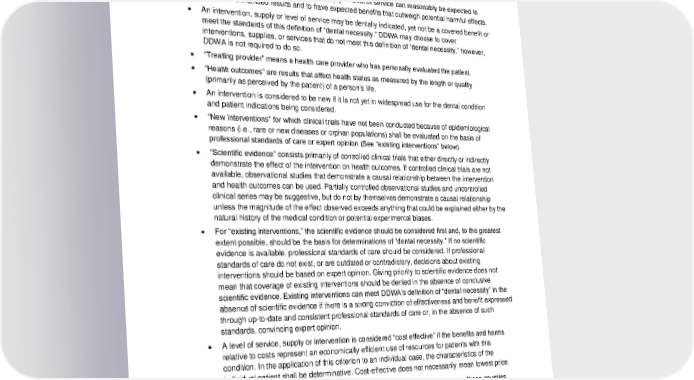 • A health “intervention” is an item or service delivered or undertaken primarily to treat (i.e., prevent, diagnose, detect, treat or palliate) a dental condition (i.e., disease, illness, injury, genetic or congenital defect or a biological condition that lies outside the range of normal, age-appropriate human variation) or to maintain or restore functional ability. For purposes of this definition of “dental necessity,” a health intervention means not only the intervention itself, but also the dental condition and patient indications for which it is being applied. • “Effective” means that the intervention, supply or level of service can reasonably be expected to produce the intended results and to have expected benefits that outweigh potential harmful effects. • An intervention, supply or level of service may be dentally indicated, yet not be a covered benefit or meet the standards of this definition of “dental necessity.” DDWA may choose to cover interventions, supplies, or services that do not meet this definition of “dental necessity,” however, DDWA is not required to do so. • “Treating provider” means a health care provider who has personally evaluated the patient. • “Health outcomes” are results that affect health status as measured by the length or quality (primarily as perceived by the patient) of a person's life. • An intervention is considered to be new if it is not yet in widespread use for the dental condition and patient indications being considered. • “New interventions” for which clinical trials have not been conducted because of epidemiological reasons (i.e., rare or new diseases or orphan populations) shall be evaluated on the basis of professional standards of care or expert opinion (See “existing interventions” below). • “Scientific evidence” consists primarily of controlled clinical trials that either directly or indirectly demonstrate the effect of the intervention on health outcomes. If controlled clinical trials are not available, observational studies that demonstrate a causal relationship between the intervention and health outcomes can be used. Partially controlled observational studies and uncontrolled clinical series may be suggestive, but do not by themselves demonstrate a causal relationship unless the magnitude of the effect observed exceeds anything that could be explained either by the natural history of the medical condition or potential experimental biases. • For “existing interventions,” the scientific evidence should be considered first and, to the greatest extent possible, should be the basis for determinations of “dental necessity.” If no scientific evidence is available, professional standards of care should be considered. If professional standards of care do not exist, or are outdated or contradictory, decisions about existing interventions should be based on expert opinion. Giving priority to scientific evidence does not mean that coverage of existing interventions should be denied in the absence of conclusive scientific evidence. Existing interventions can meet DDWA’s definition of “dental necessity” in the absence of scientific evidence if there is a strong conviction of effectiveness and benefit expressed through up-to-date and consistent professional standards of care or, in the absence of such standards, convincing expert opinion. • A level of service, supply or intervention is considered “cost effective” if the benefits and harms relative to costs represent an economically efficient use of resources for patients with this condition. In the application of this criterion to an individual case, the characteristics of the individual patient shall be determinative. Cost-effective does not necessarily mean lowest price. PEBB Employer group — for the Public Employees Benefits Board (PEBB) Program means those counties, municipalities, political subdivisions, the Washington health benefits exchange, tribal governments, and employee organizations representing state civil service employees obtaining employee benefits through a contractual agreement with the Health Care Authority (HCA) to participate in benefit plans developed by the PEB board. Plan: DeltaCare, a managed dental benefit plan of coverage. In the eligibility sections “plan” may mean a plan other than DeltaCare not sponsored by the PEBB Program. 2024-01-03100-BB 3 DCL 20240101