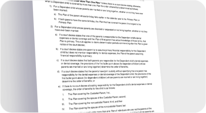 “Non-Dependent or Dependent:” The Plan that covers you other than as a Dependent, for example as an employee, member, policyholder, subscriber or retiree is the Primary Plan and the Plan that covers you as a Dependent is the Secondary Plan. However, if you are a Medicare beneficiary and, as a result of federal law, Medicare is secondary to the Plan covering you as a Dependent, and primary to the Plan covering you as other than a Dependent (e.g., a retired employee), then the order of benefits between the two Plans is reversed so that the Plan covering you as an employee, member, policyholder, subscriber or retiree is the Secondary Plan and the other Plan is the Primary Plan. “Dependent Child Covered Under More Than One Plan:” Unless there is a court decree stating otherwise, when a Dependent child is covered by more than one Plan the order of benefits is determined as follows: 1) For a Dependent child whose parents are married or are living together, whether or not they have ever been married: a) The Plan of the parent whose birthday falls earlier in the calendar year is the Primary Plan; or b) If both parents have the same birthday, the Plan that has covered the parent the longest is the Primary Plan. 2) For a Dependent child whose parents are divorced or separated or not living together, whether or not they have ever been married: a) If a court decree states that one of the parents is responsible for the Dependent child's dental expenses or dental coverage and the Plan of that parent has actual knowledge of those terms, that Plan is primary. This rule applies to claims determination periods commencing after the Plan is given notice of the court decree; b) If a court decree states one parent is to assume primary financial responsibility for the Dependent child but does not mention responsibility for dental expenses, the Plan of the parent assuming financial responsibility is primary; c) If a court decree states that both parents are responsible for the Dependent child's dental expenses or dental coverage, the provisions of the first bullet point above (for dependent child(ren) whose parents are married or are living together) determine the order of benefits; d) If a court decree states that the parents have joint custody without specifying that one parent has responsibility for the dental expenses or dental coverage of the Dependent child, the provisions of the first bullet point above (for dependent child(ren) whose parents are married or are living together) determine the order of benefits; or e) If there is no court decree allocating responsibility for the Dependent child's dental expenses or dental coverage, the order of benefits for the child is as follows: I. The Plan covering the Custodial Parent, first; II. The Plan covering the spouse of the Custodial Parent, second; III. The Plan covering the noncustodial Parent, third; and then IV. The Plan covering the spouse of the noncustodial Parent, last 3) For a Dependent child covered under more than one Plan of individuals who are not the parents of the child, the provisions of the first or second bullet points above (for dependent child(ren) whose parents are married or are living together or for dependent child(ren) whose parents are divorced or separated or not living together) determine the order of benefits as if those individuals were the parents of the child. 2024-01-03100-BB 40 DCL 20240101