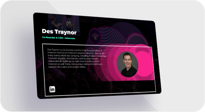 Des Traynor Co-founder & CSO • Intercom Des Traynor is a Co-founder and the Chief Strategy Officer of Intercom and sits on Intercom’s board of directors. Des has led many teams within the company, including Product, Marketing, Customer Support, and Content, and has been directly responsible for building out even more functions within Intercom as well. Today, Des oversees Intercom's R&D team, based in the Dublin and London offices.
