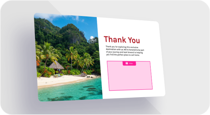 Destionation Microsite Page 5 Thank You Thank you for exploring this exclusive destination with us. We’re honored to be part of your journey and look forward to helping you find the perfect place to call home. Video