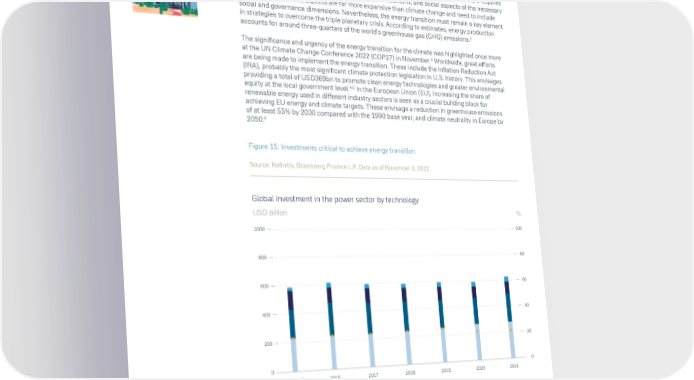 CIO Insights Resilience versus recession 10 ESG: energy transition – climate is macro essential ESG investment aims to change the way we live and do business. A fundamental shift needs to take place, as virtually all experts agree that the “triple planetary crisis” – climate change, pollution and loss of biodiversity – constitutes an existential threat to humankind.1 The primary cause of the structural market failure that has led to this crisis is that we have neglected to integrate the systematic value of nature into our economic model. Overcoming this challenge therefore requires a holistic approach that incorporates all the relevant economic and social aspects of the necessary transformation. These aspects are far more expansive than climate change and need to include social and governance dimensions. Nevertheless, the energy transition must remain a key element in strategies to overcome the triple planetary crisis. According to estimates, energy production 2 accounts for around three-quarters of the world’s greenhouse gas (GHG) emissions. The significance and urgency of the energy transition for the climate was highlighted once more 3 at the UN Climate Change Conference 2022 (COP27) in November. Worldwide, great efforts are being made to implement the energy transition. These include the Inflation Reduction Act (IRA), probably the most significant climate protection legislation in U.S. history. This envisages providing a total of USD369bn to promote clean energy technologies and greater environmental equity at the local government level.4,5 In the European Union (EU), increasing the share of renewable energy used in different industry sectors is seen as a crucial building block for achieving EU energy and climate targets. These envisage a reduction in greenhouse emissions of at least 55% by 2030 compared with the 1990 base year, and climate neutrality in Europe by 6 2050. Figure 15: Investments critical to achieve energy transition Source: Refinitiv, Bloomberg Finance L.P. Data as of November 3, 2022. Global investment in the power sector by technology USD billion % 1000 100 800 80 600 60 400 40 200 20 0 0 2011-15 2016 2017 2018 2019 2020 2021 Renewable power (lhs) Electricity networks (lhs) Fossil fuel power (lhs) Nuclear (lhs) Battery storage (lhs) EMDE* share (rhs) In Europe, Middle East and Africa as well as in Asia Pacific this material is considered marketing material, but this is not the case in the U.S. No assurance can be given that any forecast or target can be achieved. Forecasts are based on assumptions, estimates, opinions and hypothetical models which may prove to be incorrect. Past performance is not indicative of future returns. Performance refers to a nominal value based on price gains/losses and does not take into account inflation. Inflation will have a negative impact on the purchasing power of this nominal monetary value. Depending on the current level of inflation, this may lead to a real loss in value, even if the nominal performance of the investment is positive. Investments come with risk. The value of an investment can fall as well as rise and you might not get back the amount originally invested at any point in time. Your capital may be at risk. This document was produced in December 2022. 25